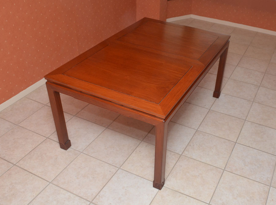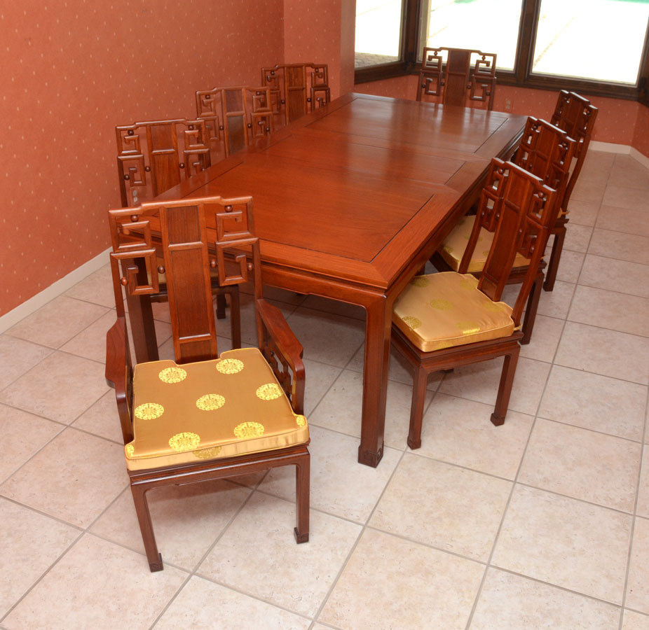 1970'S GEORGE ZEE CHINESE DINING TABLE & 8 CHAIRS: Dining table with rectangular top, carved feet, overall 31 3/4'' h. x 66'' x 42'', two 18'' leaves. Sold with 8 chairs with gold oriental motif cushions, the 2 arm chairs measures 39 1/2'' h. x 22 1/2'' x 21 1/2''. Original George Zee & Co. Hong Kong metal tags.