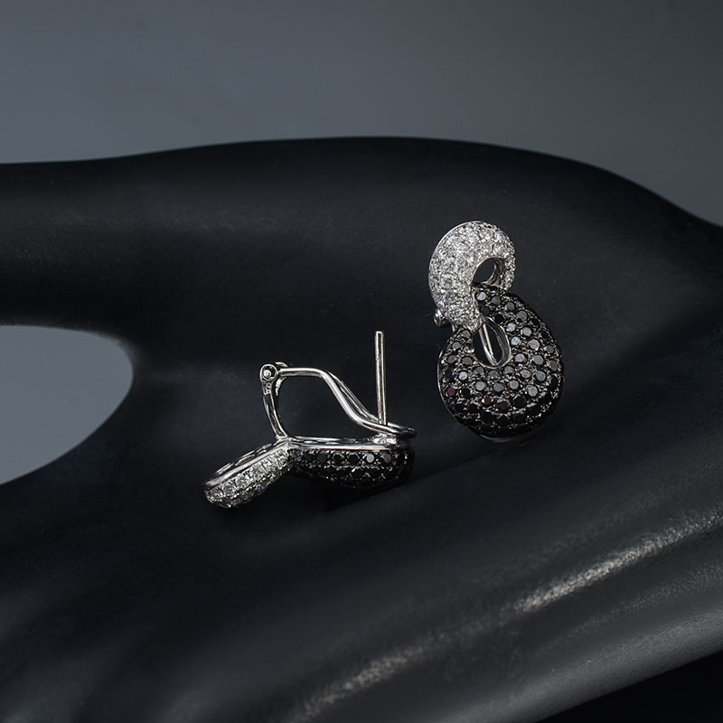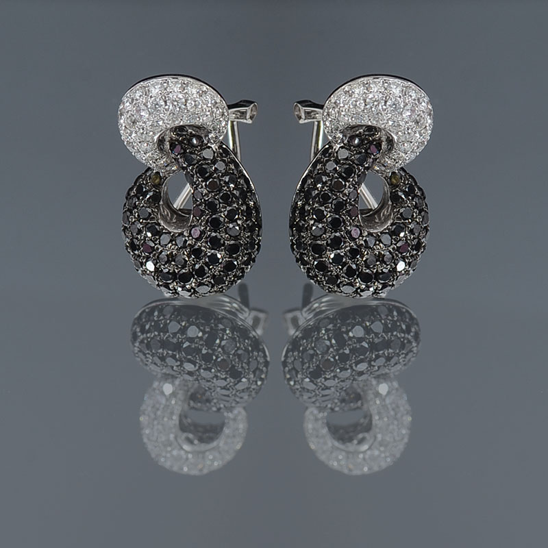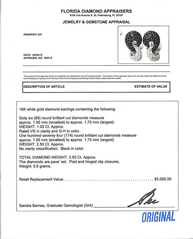 18K BLACK & WHITE DIAMOND EARRINGS: 66 round brilliant cut diamonds form the bottom of this knot while 174 round brilliant cut diamonds form the top with a weight of 3.50CT approx. Diamonds are pave set and earrings have post and hinged clip closures. Weight 5.6 grams. Sold with current Florida Diamond Appraisers GIA graduates appraisal $5000.