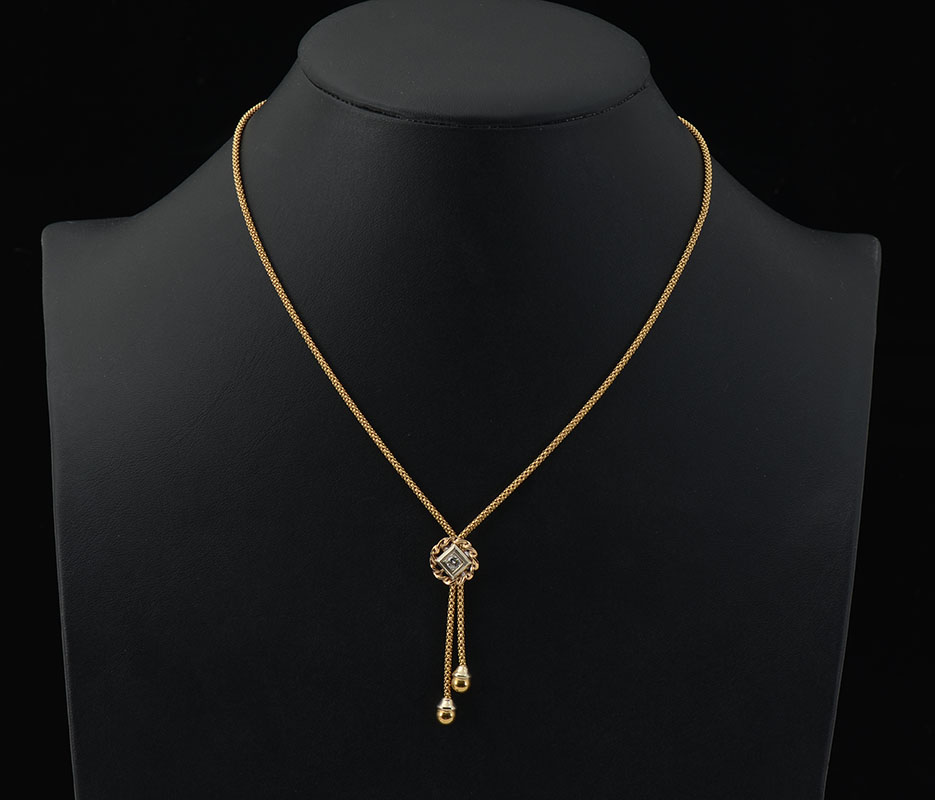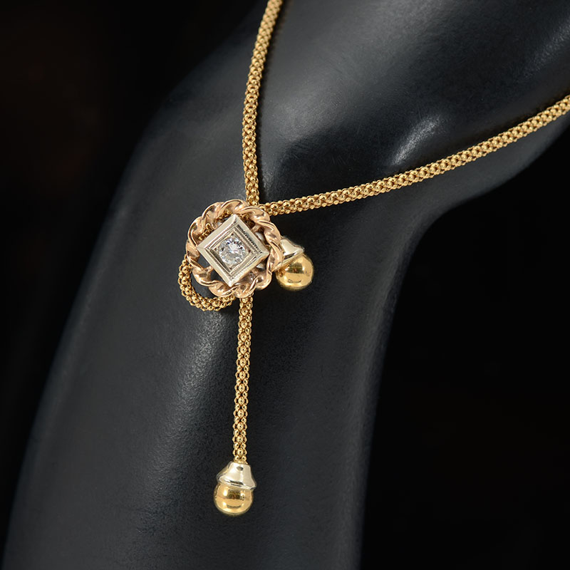 18K DIAMOND BOLO NECKLACE: 18K yellow gold bolo necklace with 14K slide containing one round brilliant cut diamond. WEIGHT: 20 Ct. Approx. VS in clarity and G-H in color. The diamond is prong set. Overall length: 20'' Weight: 10.7 grams.
