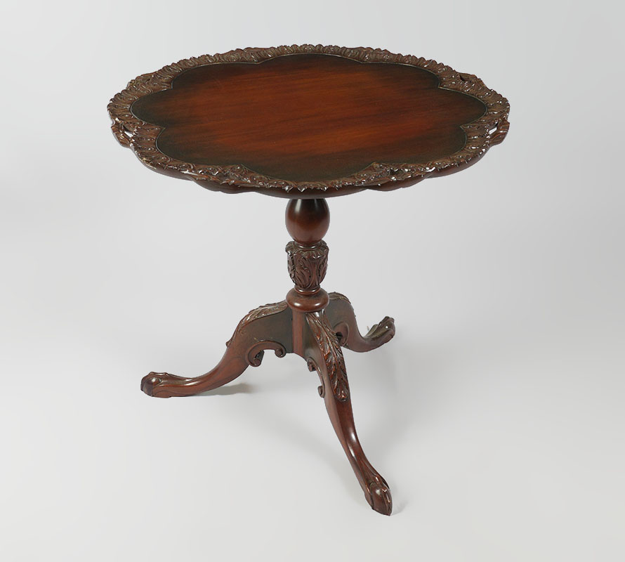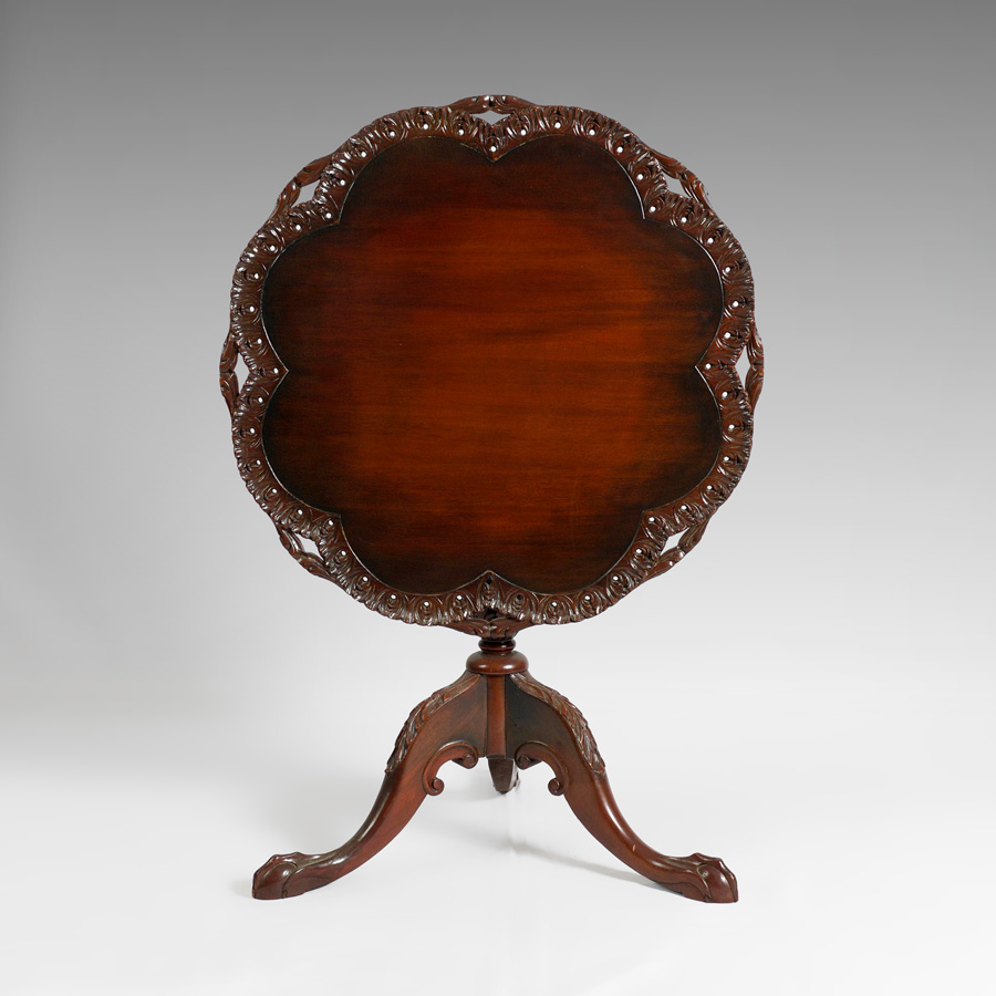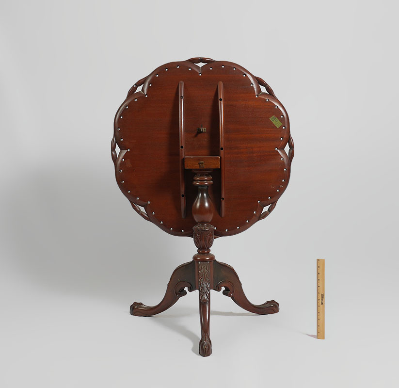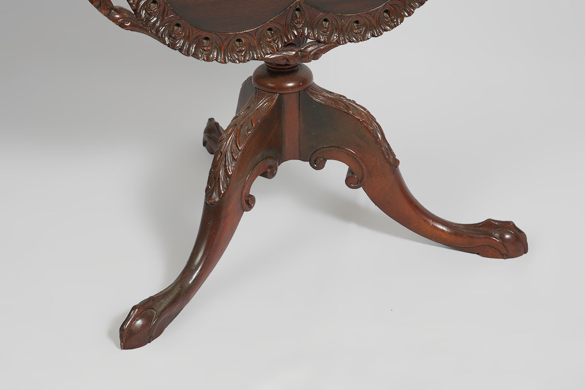 ORNATE CARVED MAHOGANY TILT TOP TABLE: 20th century Chippendale style, shaped top with foliated pierced carved border, carved and turned columns, 3 splayed legs ending in claw and ball feet. 29'' x 30 1/4''.