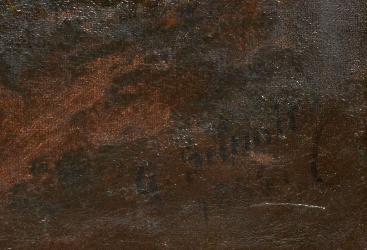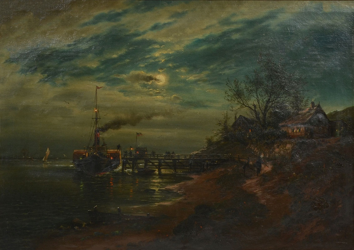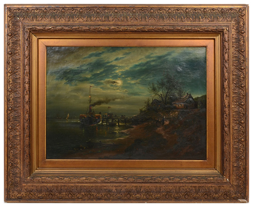 SCHMITZ, Georg, (German, 1851-1917): Nocturnal Coastal Scene with Ships and Figures, Oil on Canvas, 18.75'' x 26.75'', signed lower right, encased in heavy gilded and carved acanthus leaf gesso frame, 32.5'' x 40''.