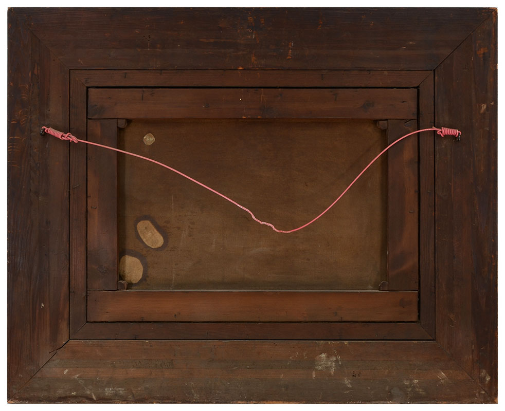 CONDITION: Frame shows wear and loss, several minor abrasions with flecks of loss, needs cleaning, several repairs with patches verso, sold as is.