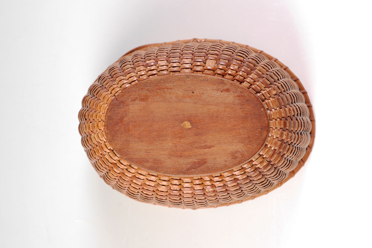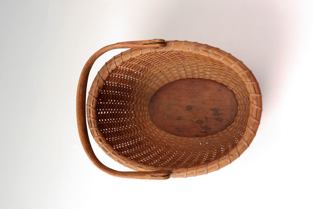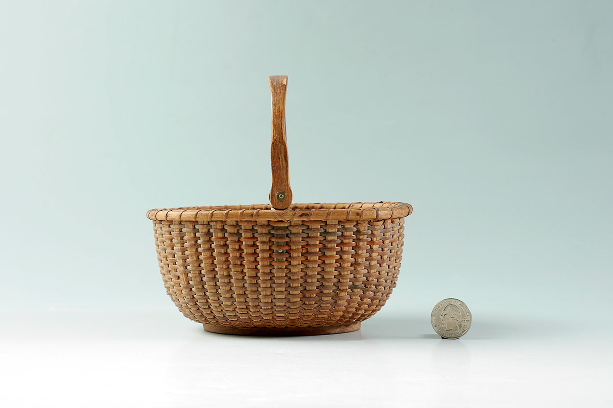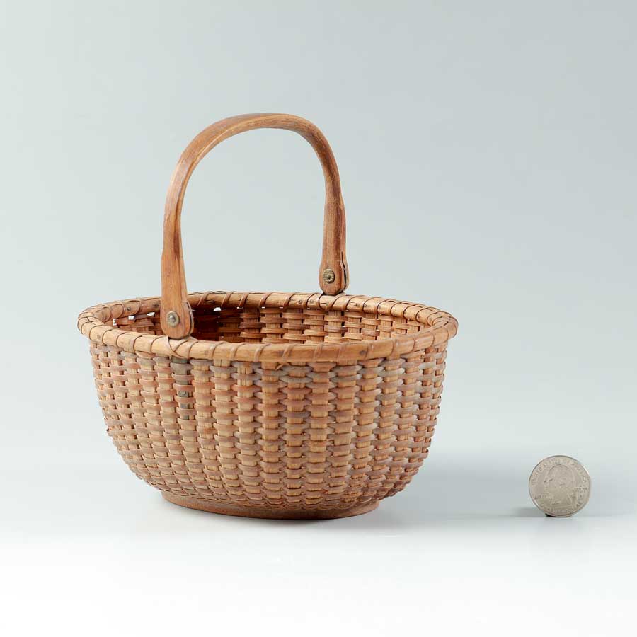 DIMINUTIVE NANTUCKET SWING HANDLE BASKET: Oval woven basket, swing handle, pin mounts. No visible makings, measures 3 3/4'' h. with handle down x 6 1/2'' x 4 1/4''.