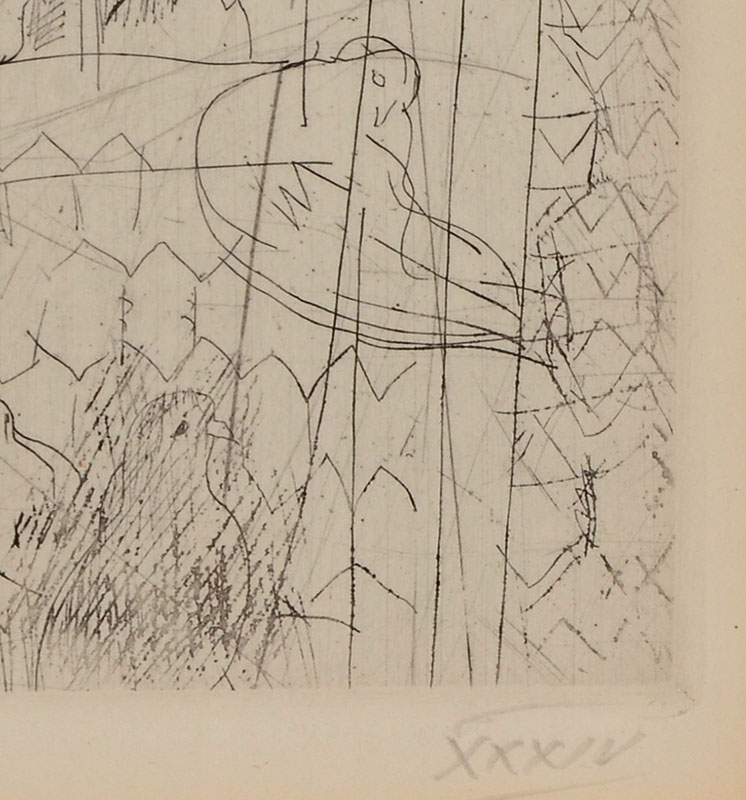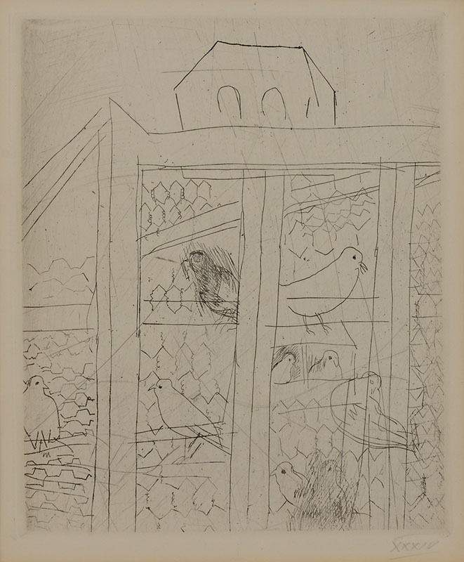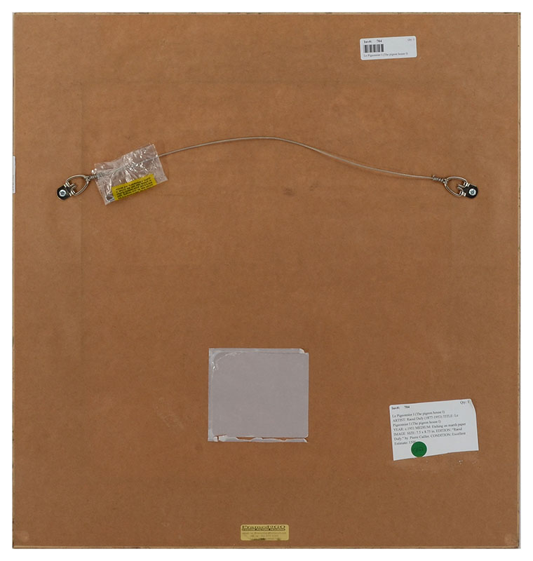 RAOUL DUFY ETCHING ''LE PIGEONNIER I'': Paper size 7.5'' x 8.75'', Cailler edition, framed, 25.5'' x 24''.