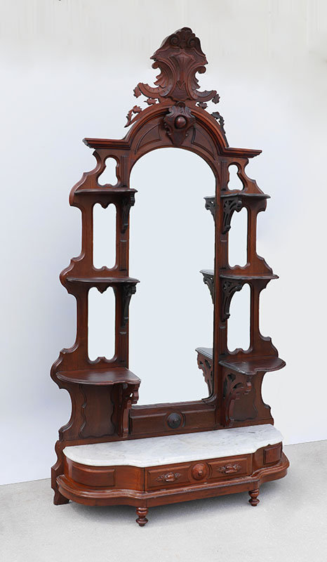 HIGH VICTORIAN CARVED WALNUT ETAGERE: Tall carved crest over arched pediment with applied decoration. Central mirror flanked by 3 graduating shelves either side with shaped mirror backs. Single drawer base, overall measures 94'' h. x 49 1/2'' x 16 1/2''.