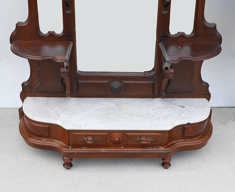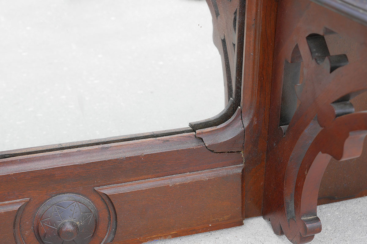 CONDITION: Sections missing on crest, stains and rings on shelves, 2 small chips top of mirror, other wear consistent with age and use.