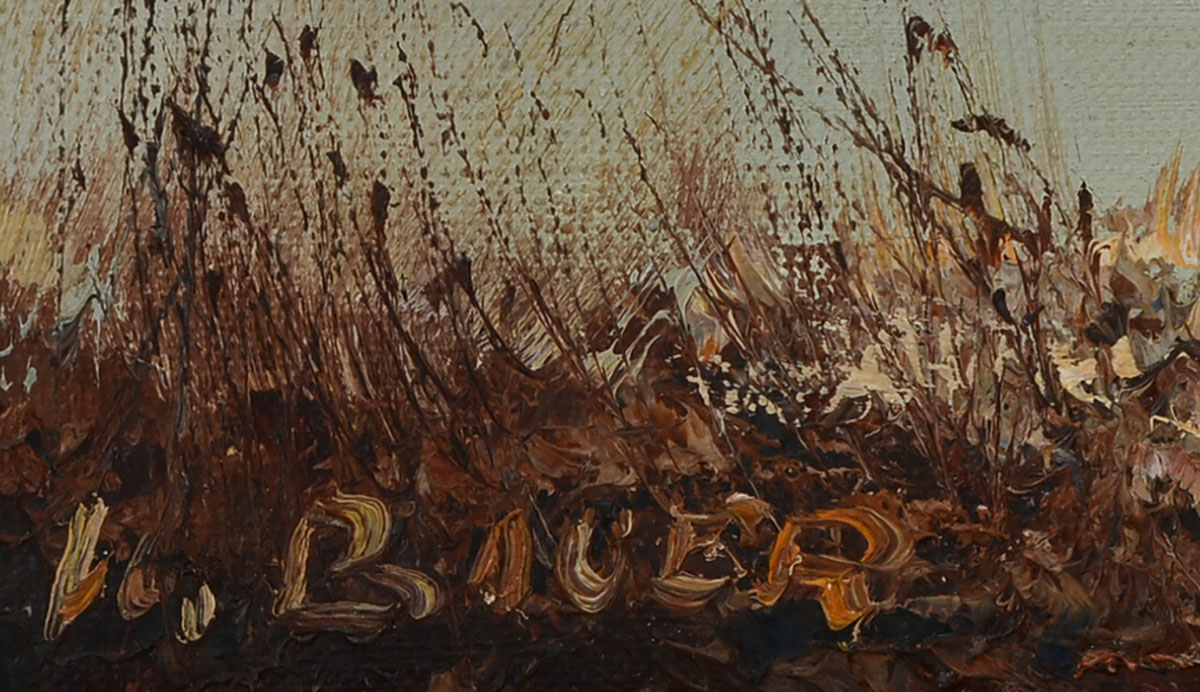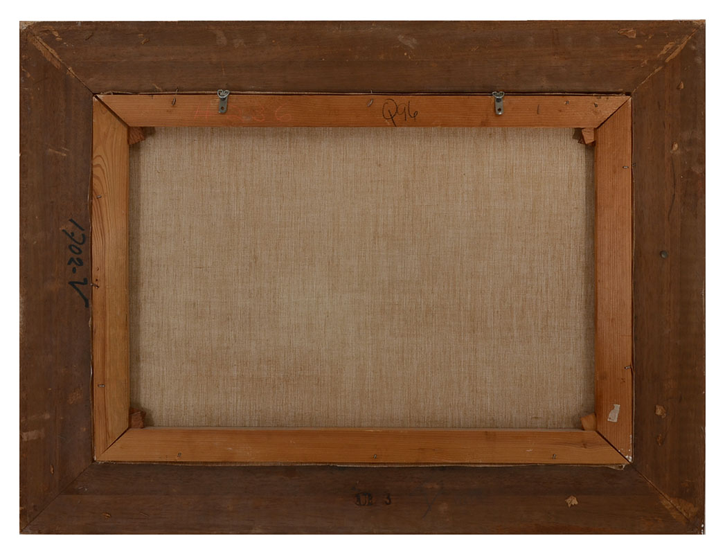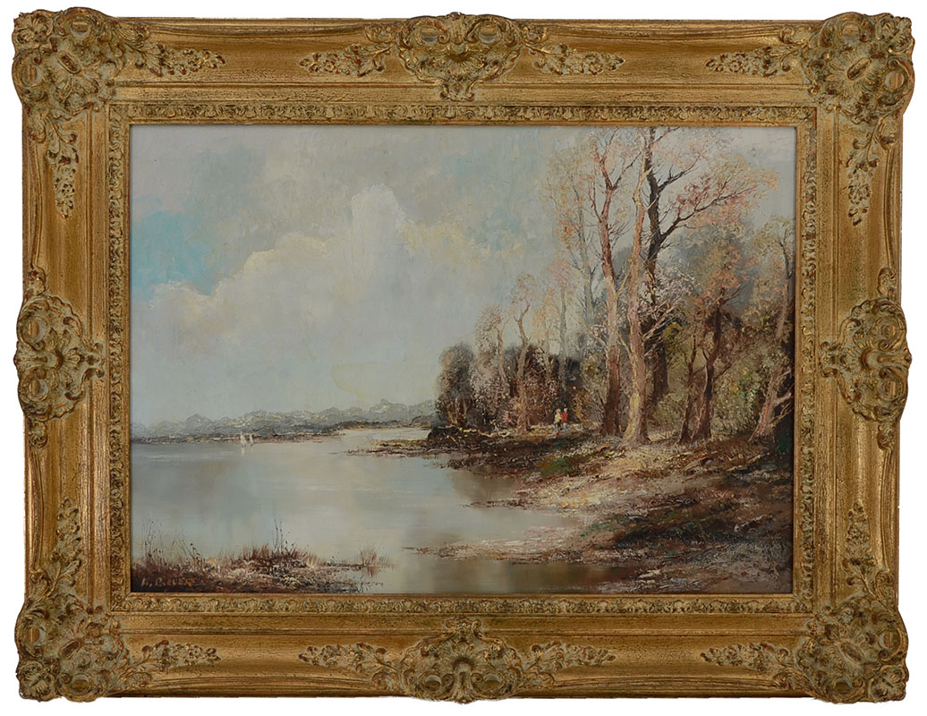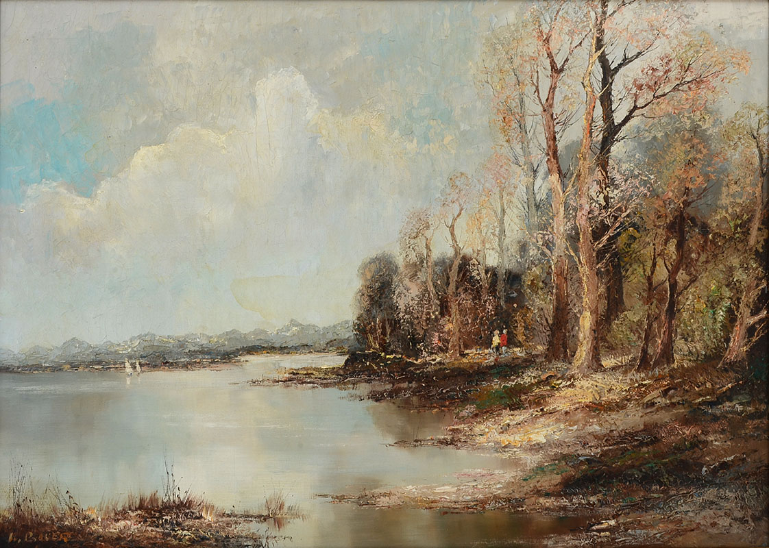 BAUER, Willi, (German, 1923-): Figures Standing on the Edge of a Lakeside Forest, Oil/Canvas, 19.5'' x 27.75'', signed lower left, pierce carved frame, 28'' x 36''. Bauer is recognized for his figure, genre and landscape paintings.