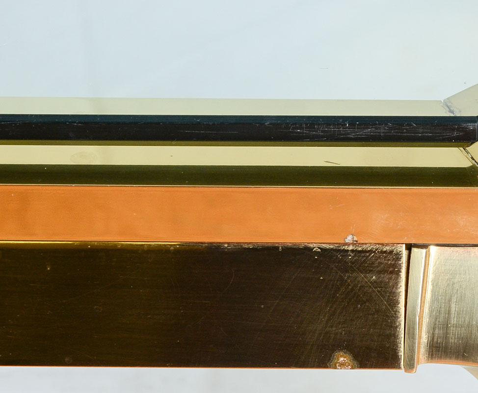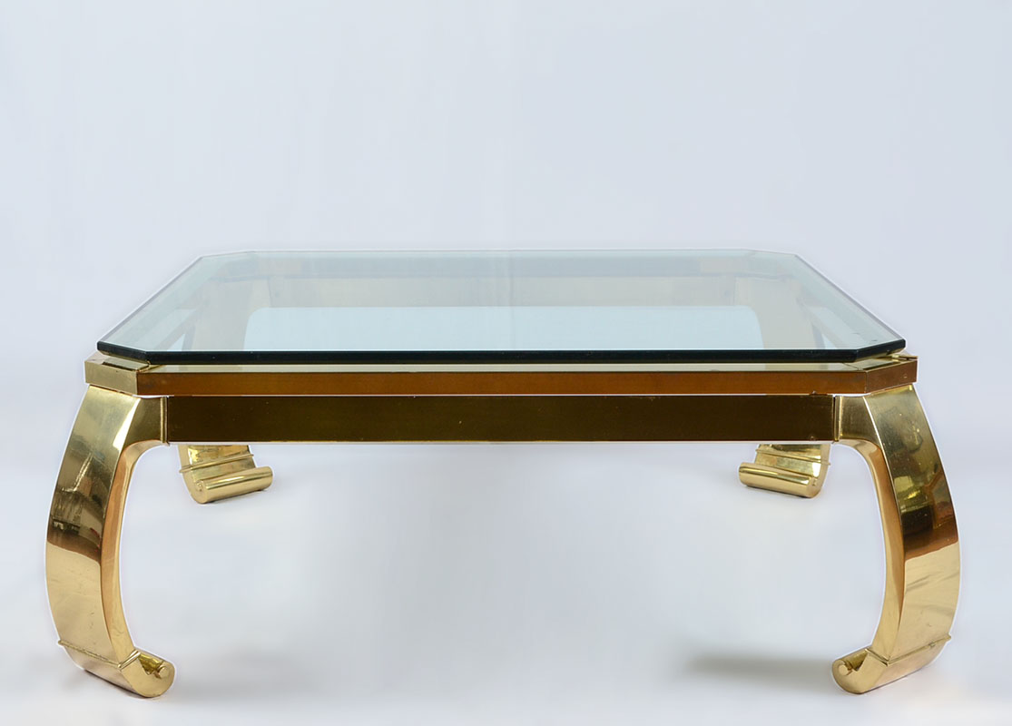 KARL SPRINGER STYLE BRASS & GLASS COFFEE TABLE: In the manner of Karl Springer, heavy brass base with canted legs ending in scroll feet. Original unknown makers label with Made in Italy. Glass top with matching canted corners. Overall measures 15'' h. x 41'' x 41''.