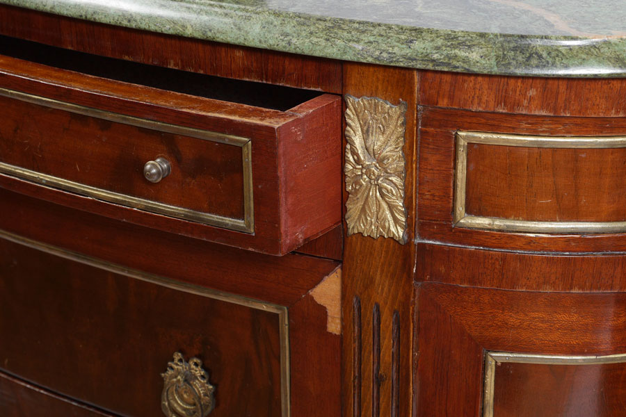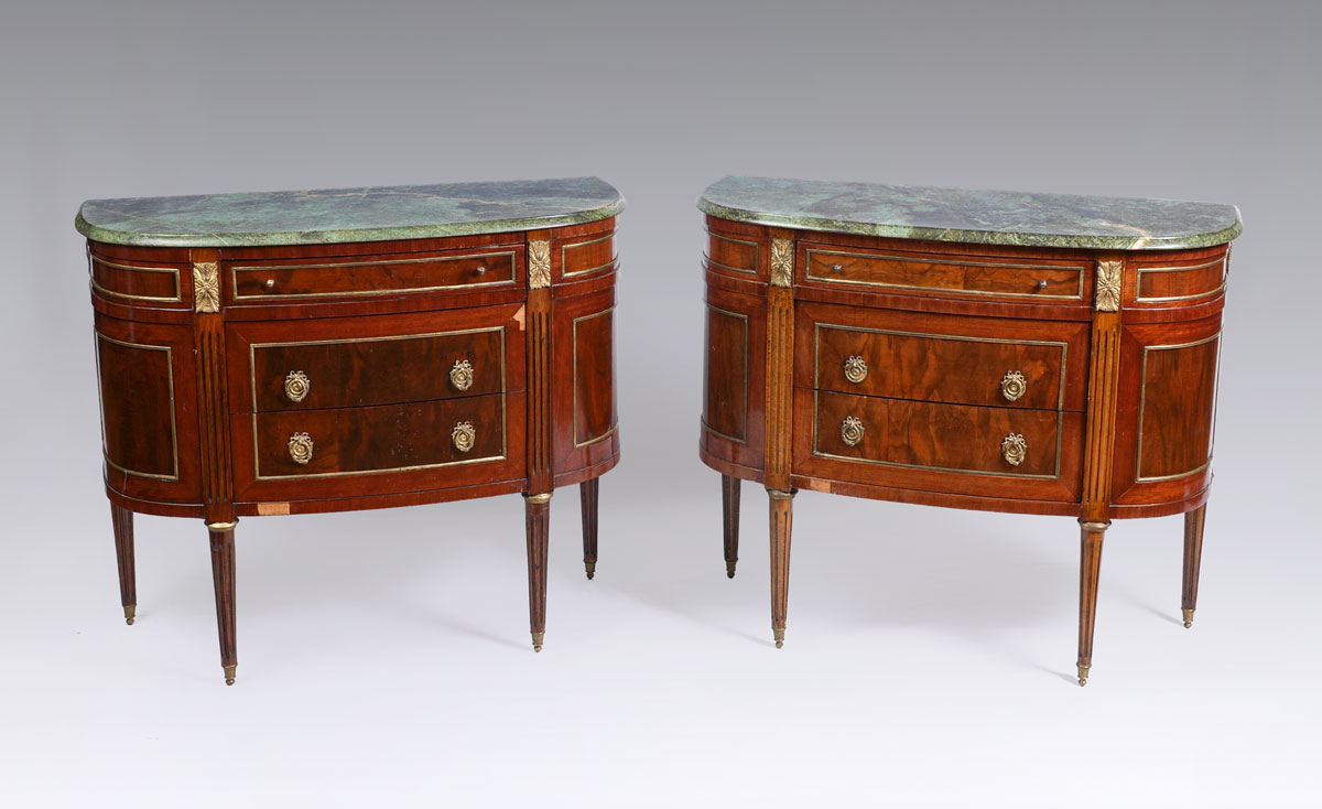 PAIR MAHOGANY MARBLE TOP COMMODES: Matched mahogany veneer commodes, variegated green marble tops, 3 center drawers, fluted stiles, gold decorated metal accents, fluted tapered legs. Overall 32 1/4'' h. x 37 1/4'' x 15 1/4''.