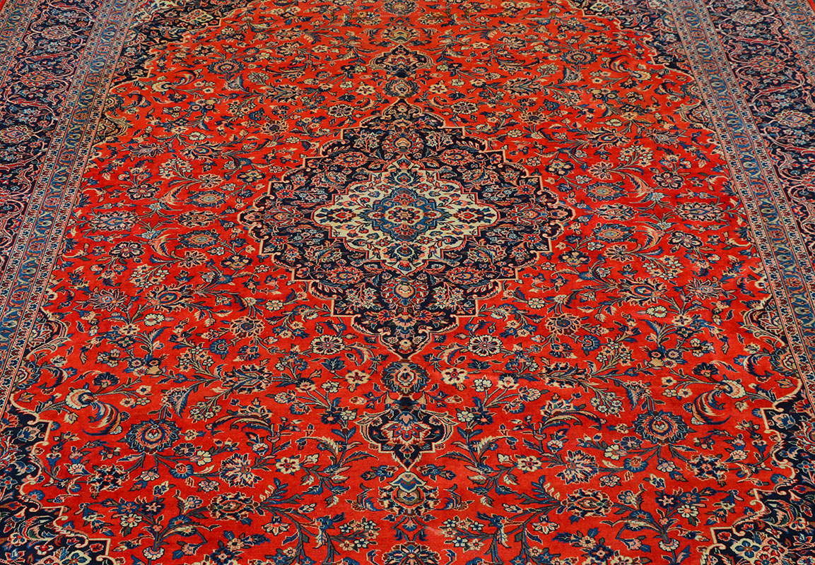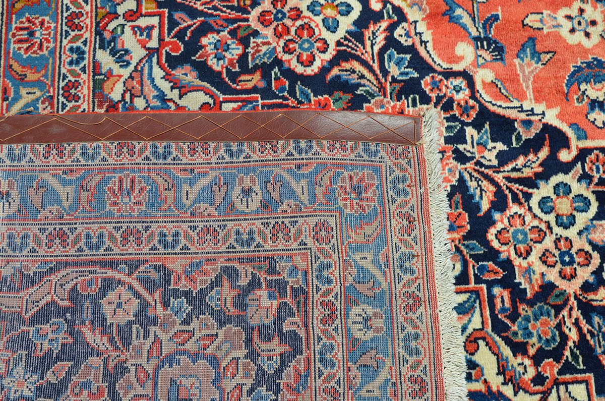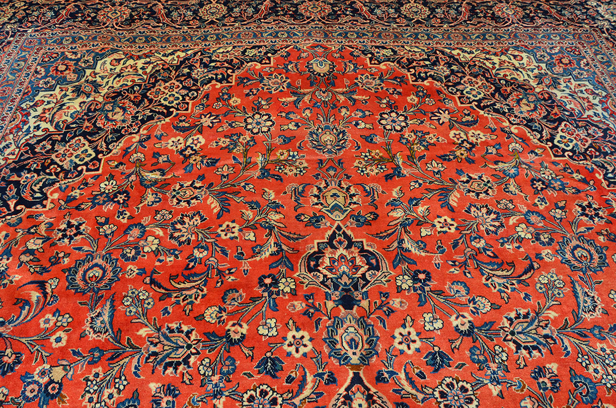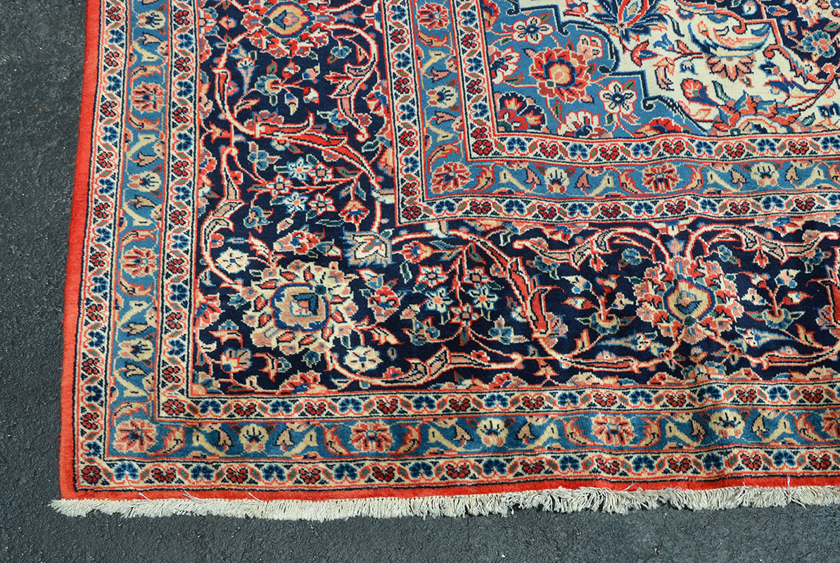 SEMI ANTIQUE PERSIAN TABRIZ HAND KNOTTED WOOL RUG 11' 7'' X 17' 8'': Room size, circa 1940's, classic traditional Tabriz pattern with vines, flower, central medallion on navy blue ground. Condition is good.