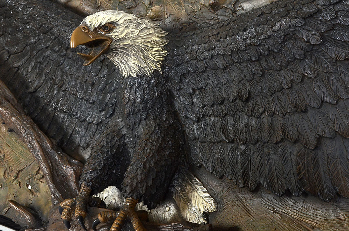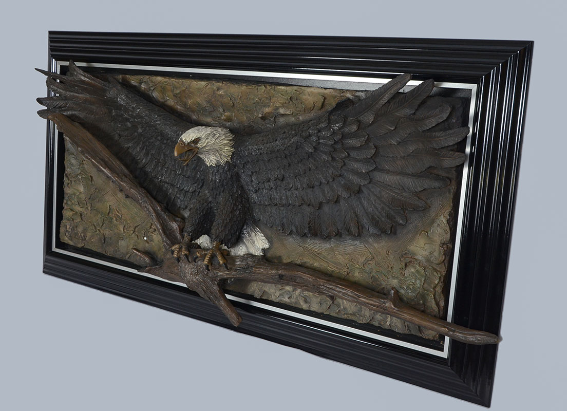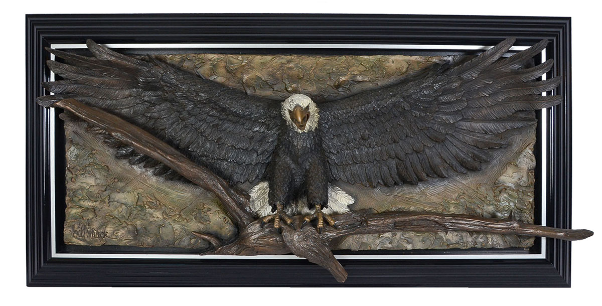 MACK, Bill, (American, b.1949): Bald Eagle Bonded and Painted Sand Sculpture, 27'' x 69'' x 14'' deep, signed lower left, custom frame, 40'' x 79''.