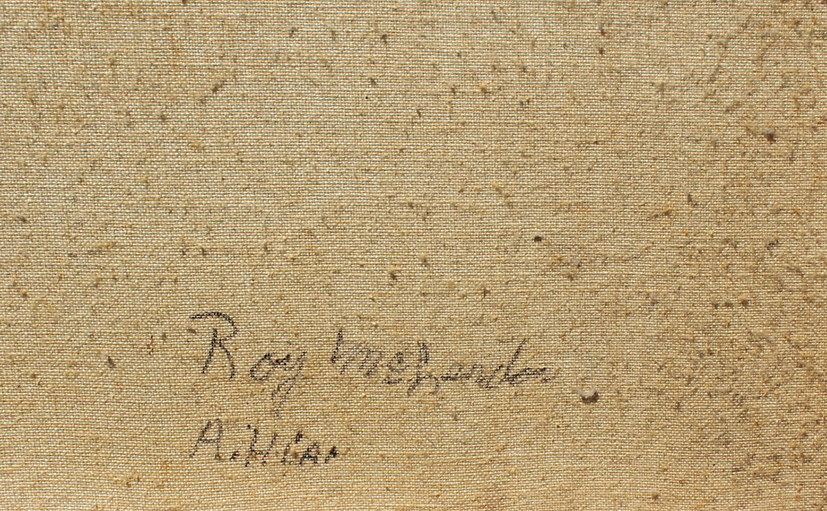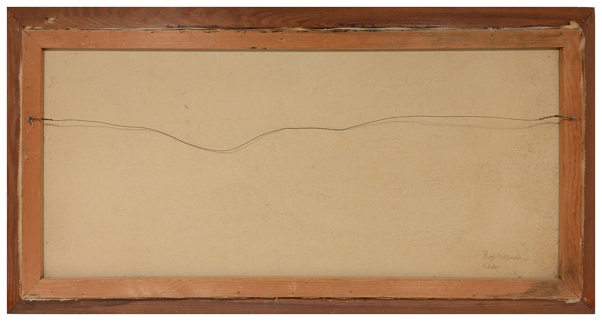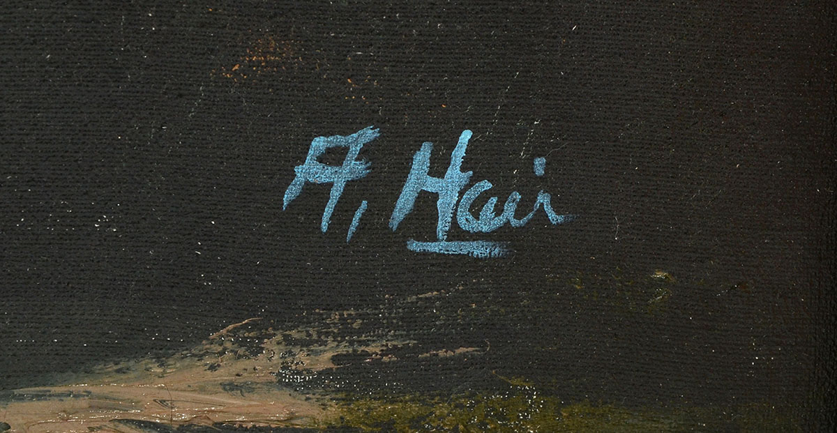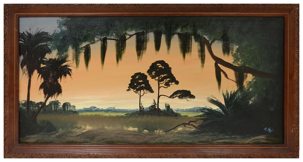 HAIR, Alfred (American, 1941-1971): Florida Highwaymen St. Johns river landscape with trees, Oil/Canvas, signed lower right, sofa size 24'' x 48, framed 28 1/2'' x 52 1/2''. Uniquely signed on back as well with both Roy McLendon and Hair signatures (Hair's name spelled wrong).