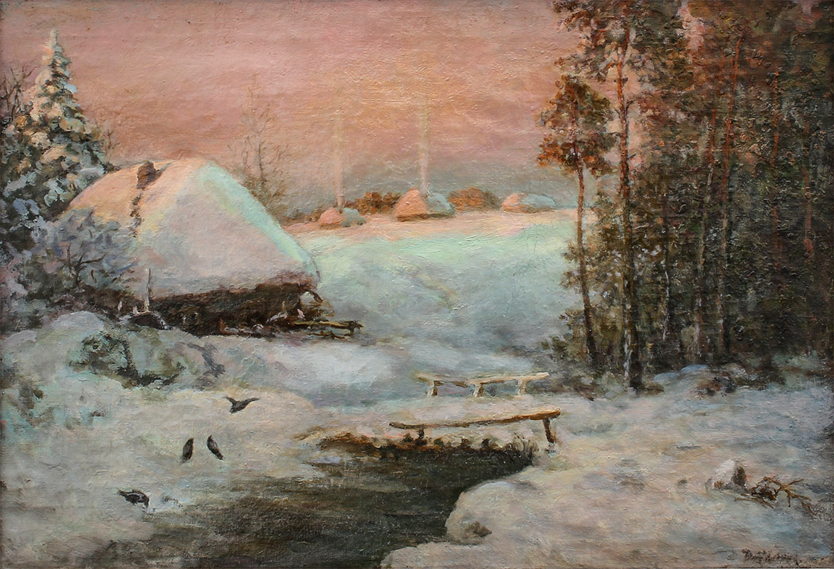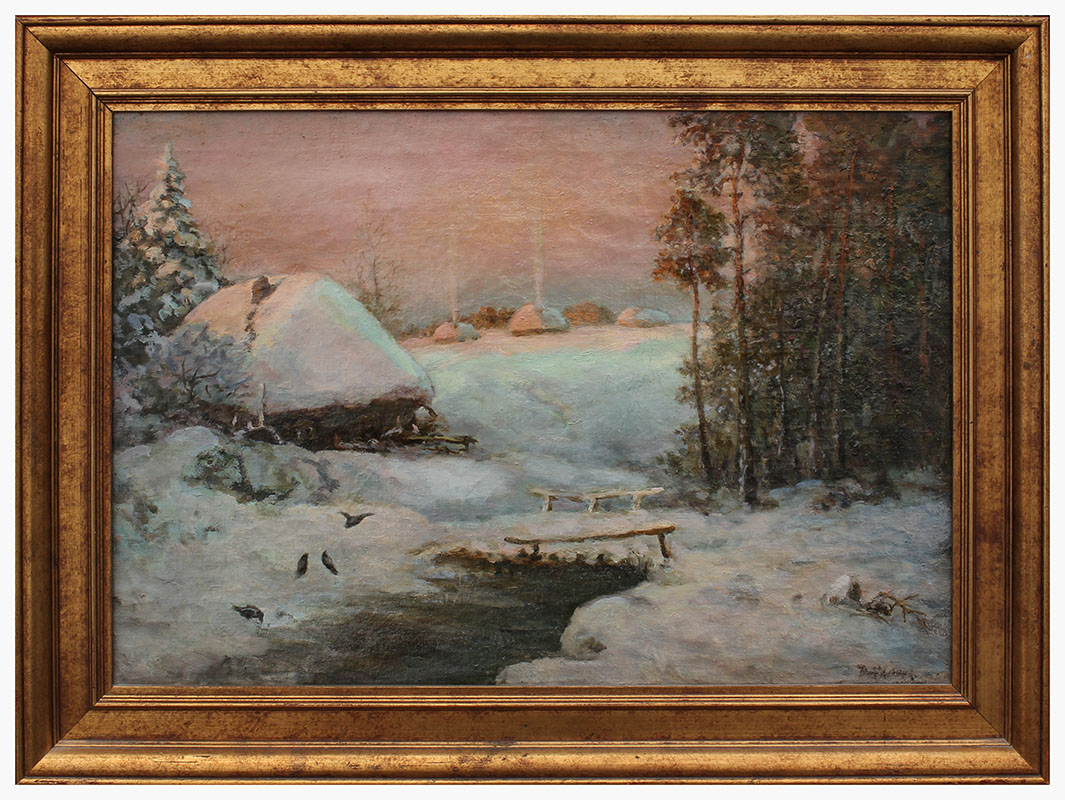 ILLEGIBLY SIGNED RUSSIAN? LANDSCAPE PAINTING: Scene Depicts a Snowy Village, Oil on Canvas, signed lower right, 19'' x 27.5'', framed, 24'' x 33''.