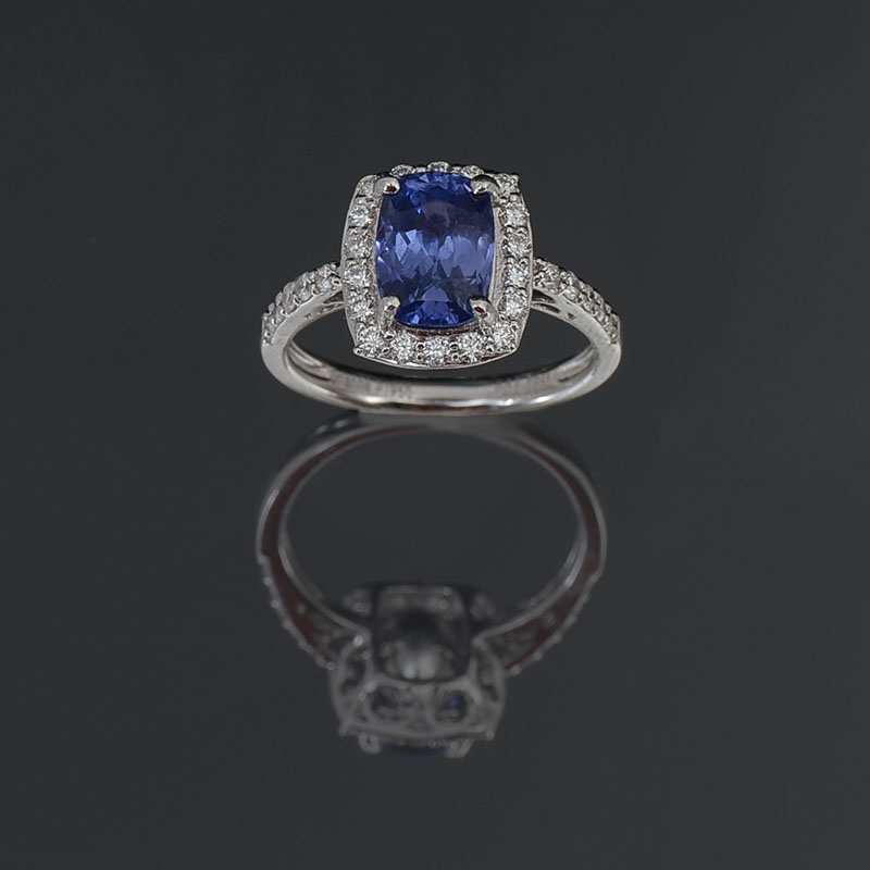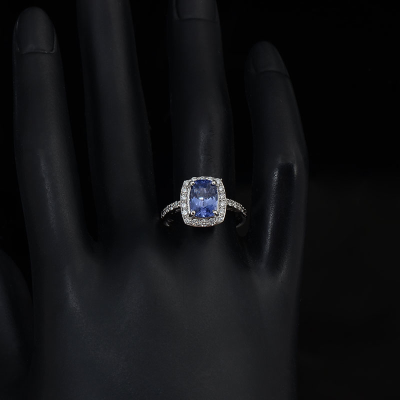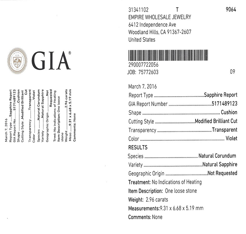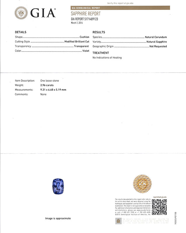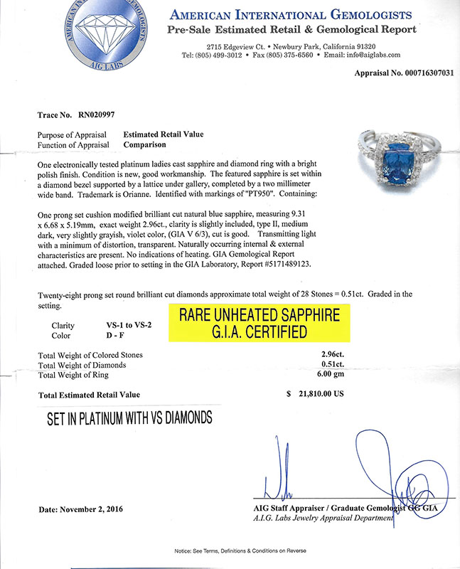 2.96CT NATURAL SAPPHIRE RING IN PLATINUM WITH DIAMONDS: Featured sapphire is set within a diamond bezel supported by a lattice under gallery and is GIA certified. 28 round brilliant cut diamonds are approx .51CT. Size 6.75''. Total weight 6.0 grams. Sold with American International Gemologists appraisal for $21,810.