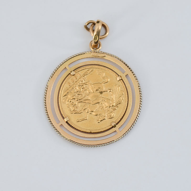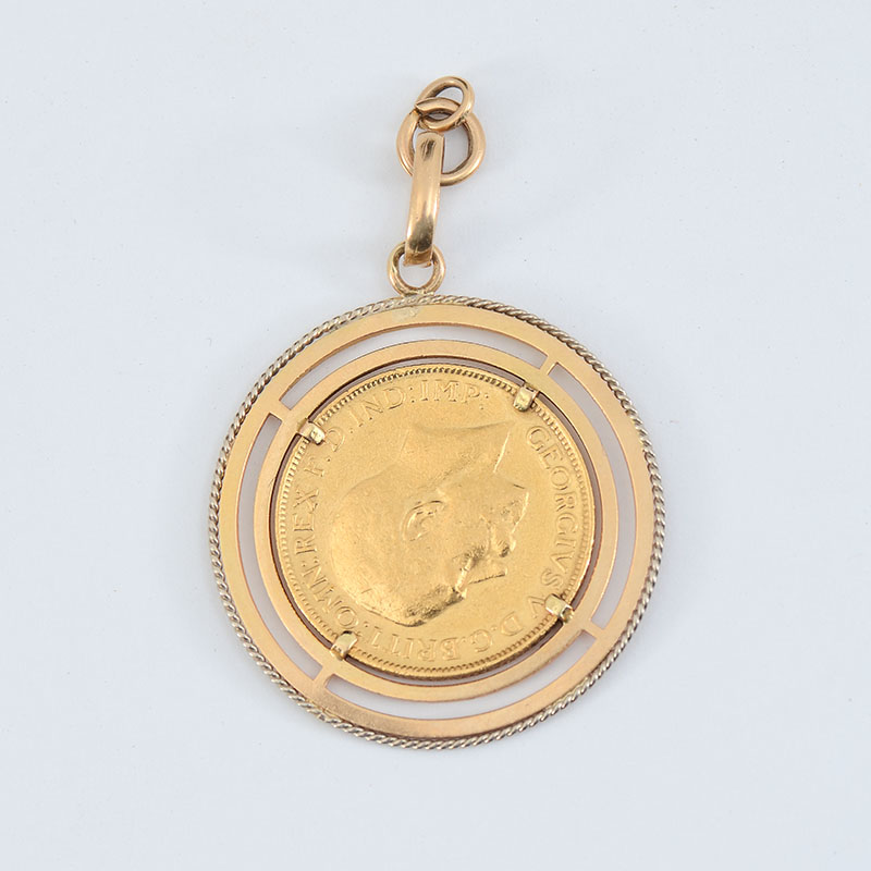 1923 AUSTRALIAN GOLD SOVEREIGN IN 18K BEZEL: 1923 ungraded gold sovereign coin with Perth city mark, mounted in 18k Italian gold pendant medallion. Sovereign 7.9 grams, total weight with bezel 11.6 grams.