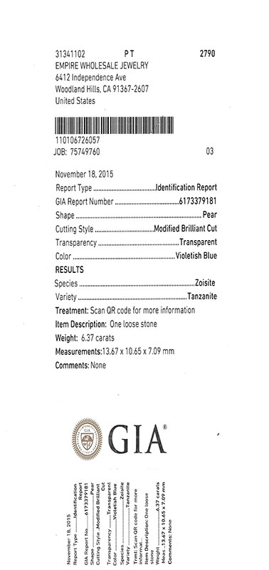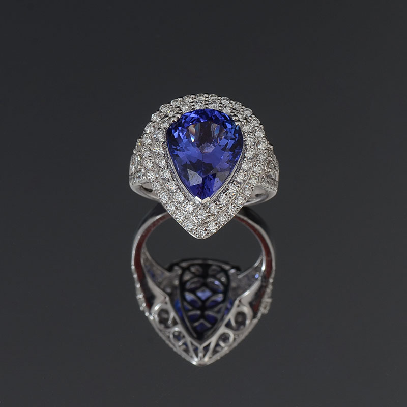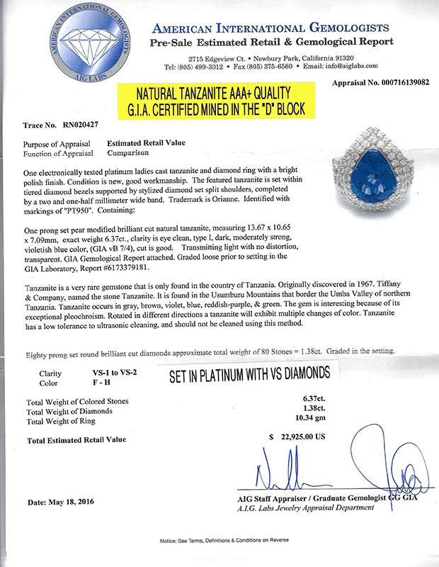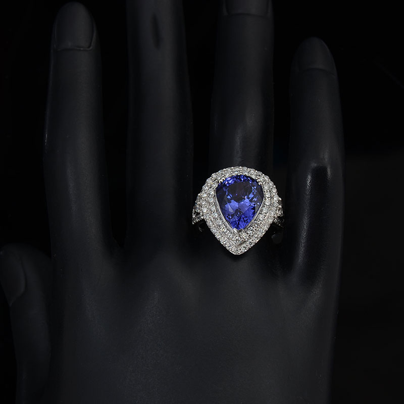 STUNNING 6.37CT TANZANITE & DIAMOND RING IN PLATINUM: Eye catching pear shaped tanzanite is set within tiered diamond bezels supported by stylized diamond set split shoulders. Natural tanzanite is GIA certified, report #6173379181. 88 round brilliant cut diamonds are set into the tiers and shoulders. Size 7. Total weight 10.34 grams. Sold with American International Gemologists appraisal for $22,925.