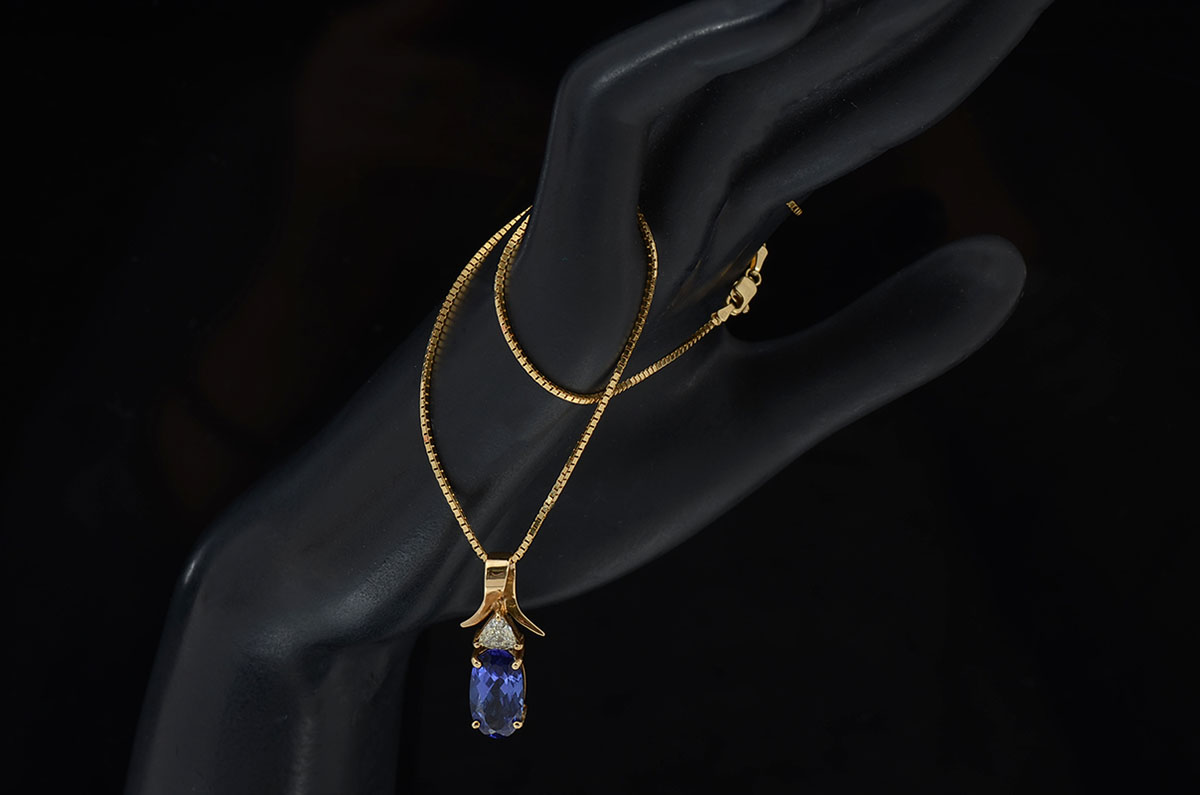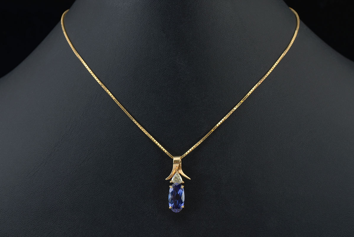 14K DIAMOND & TANZANITE NECKLACE: Set in yellow gold this triangle brilliant cut tanzanite is approx 4.25CT. and is topped with a .45CT triangle brilliant cut diamond. The tanzanite is rated VVS in clarity. Comes with a 20'' box chain necklace. Total weight is 7.3 grams. Sold with current Florida Diamond Appraisers GIA graduates appraisal for $4950.