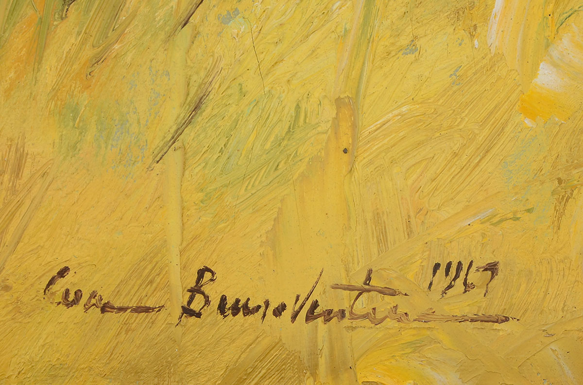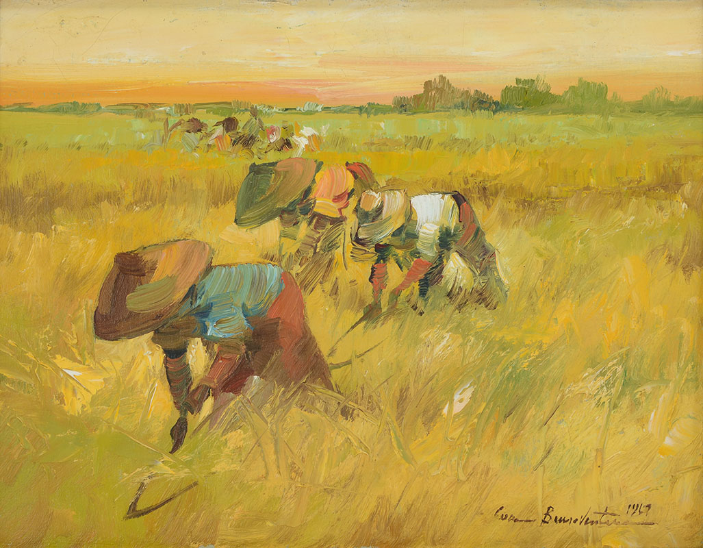 BUENAVENTURA, Cesar, (Filipino, 1922-1983): Working the Field on a Hot Sunny Day, Oil on Canvas, 14'' x 18'', signed lower right, dated 1967, carved and painted frame, 17.25'' x 21''.