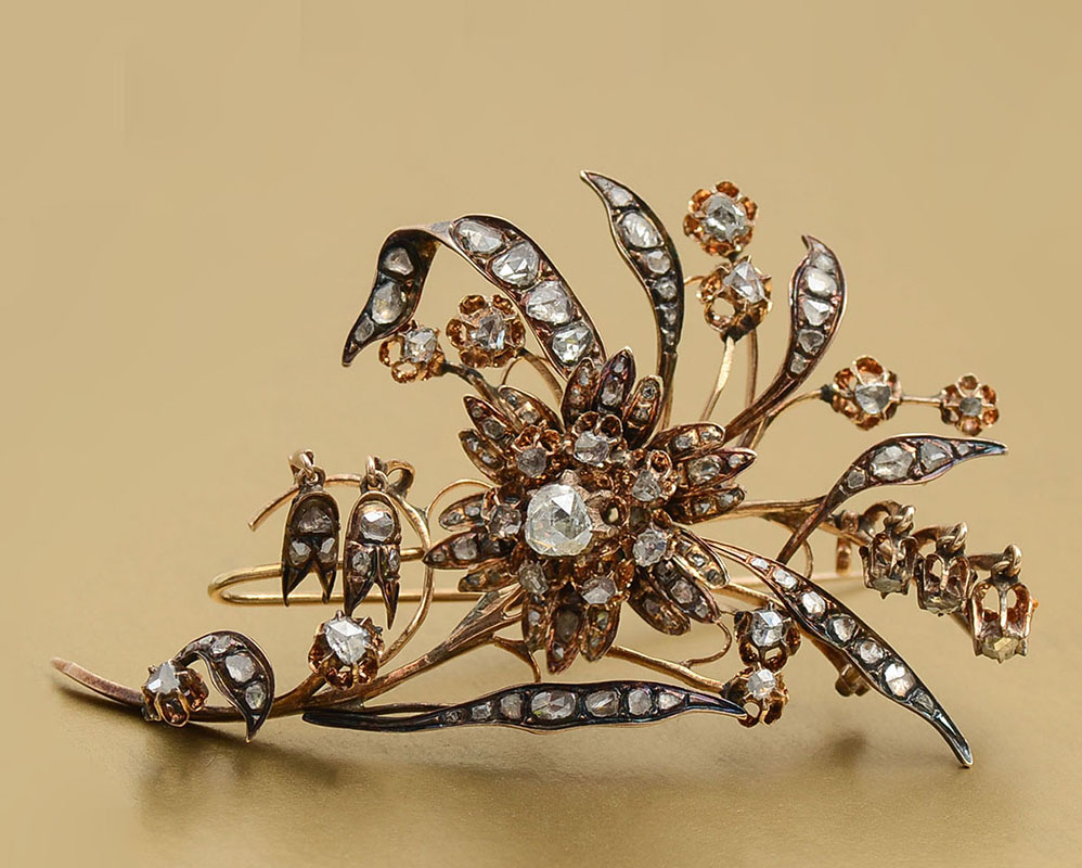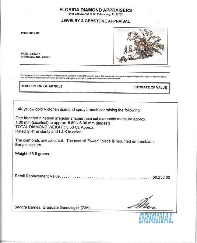 14K & DIAMOND VICTORIAN TREMBLANT BROOCH: One hundred nineteen irregular shaped rose cut diamonds are strategically placed and collet set. The center flower piece is mounted ''en tremblant''. The diamond weight is 3.50CTW approx and they are rated SI-I1 and I-J-K in color. Measures approx 3.25'' x 2.25''. Total weight is 35.5 grams. Sold with current Florida Diamond Appraisers GIA graduates appraisal for $9250.