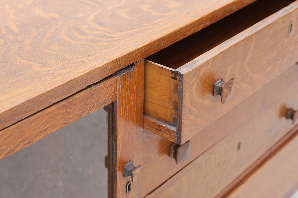 ARTS AND CRAFT OAK SIDEBOARD: 3 central drawers flanked by glass door display compartment on either side, over single full length drawers, no visible makers name or label. Measures 35 3/4'' h. x 54'' x 19''.