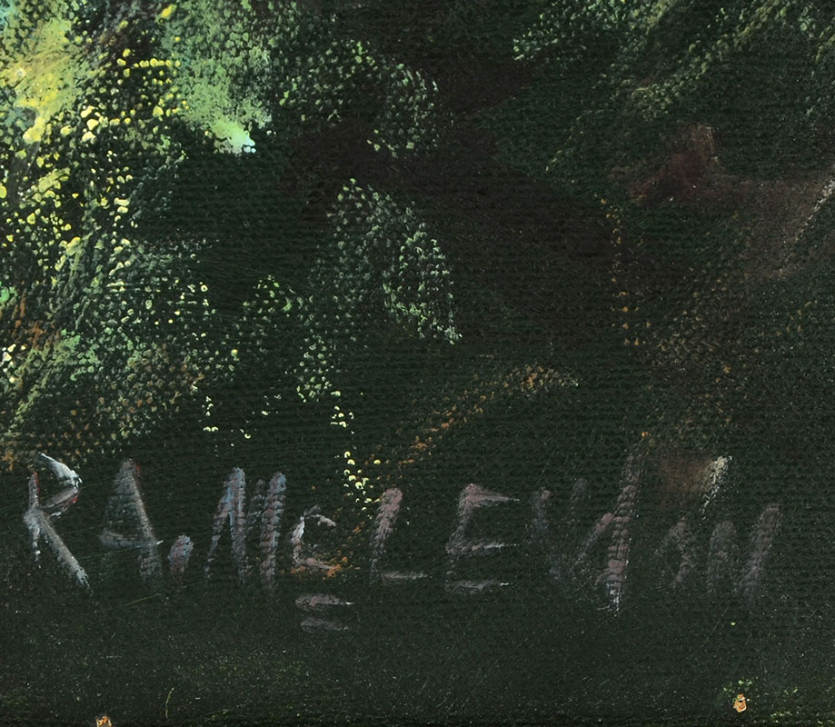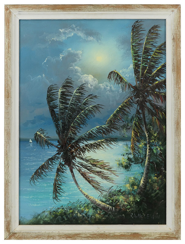 MCLENDON, Roy, (American, 20th Century): Florida Highwaymen nocturnal Indian River Lagoon scene with palm trees and boat, Oil/Canvas, 25 1/4'' x 18'', framed 27 1/2'' x 20''.