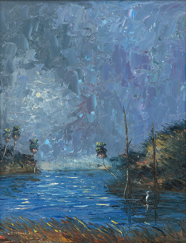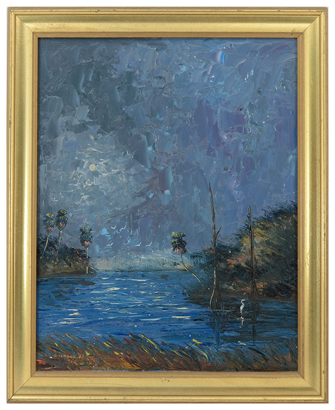WHEELER, Charles ''Chico'', (American, 20th Century): Florida Highwaymen nocturnal St. Lucie River scene, Oil/Masonite, 20'' x 16'', framed 23'' x 19''.