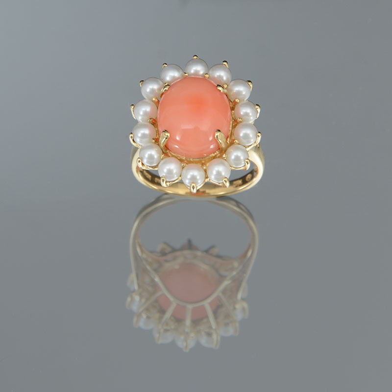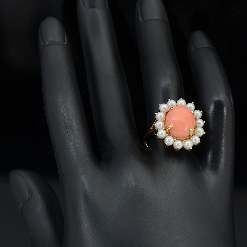 UNIQUE 14K SALMON COLORED CORAL & PEARL RING: 14K yellow gold ring contains one 12.50 x 10.50 mm oval cabochon cut piece of coral. Light salmon in color. Circled by 3.50 mm seed pearls. The coral and pearls are prong set. Weight: 6.2 grams. Size: 7.5