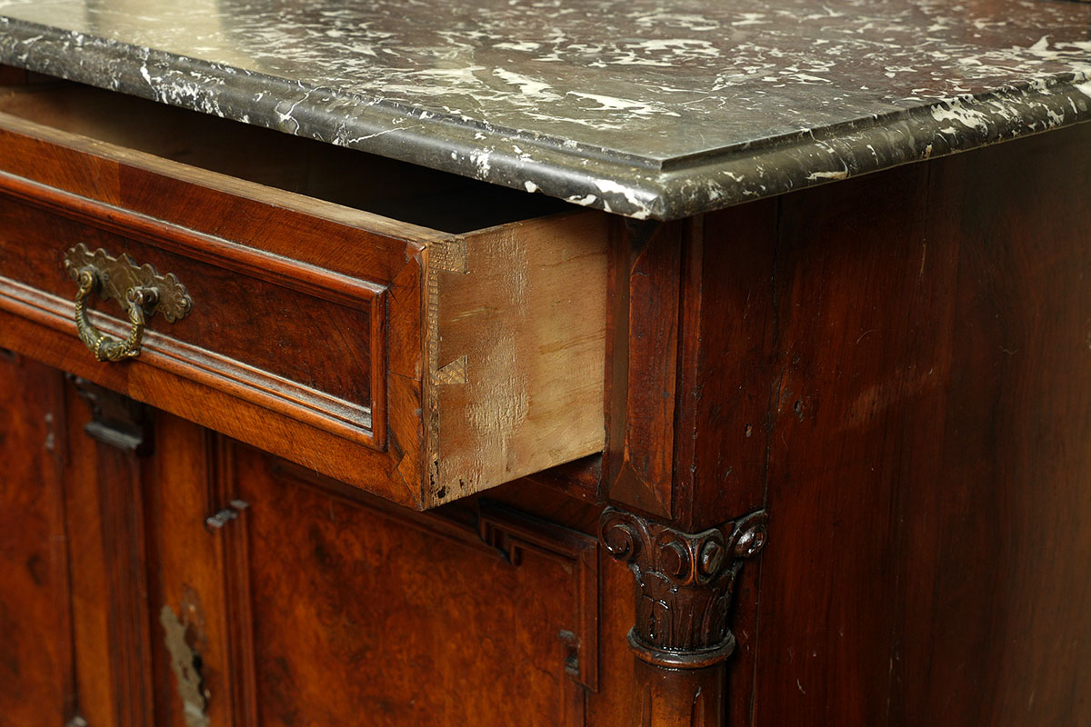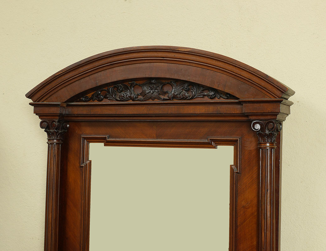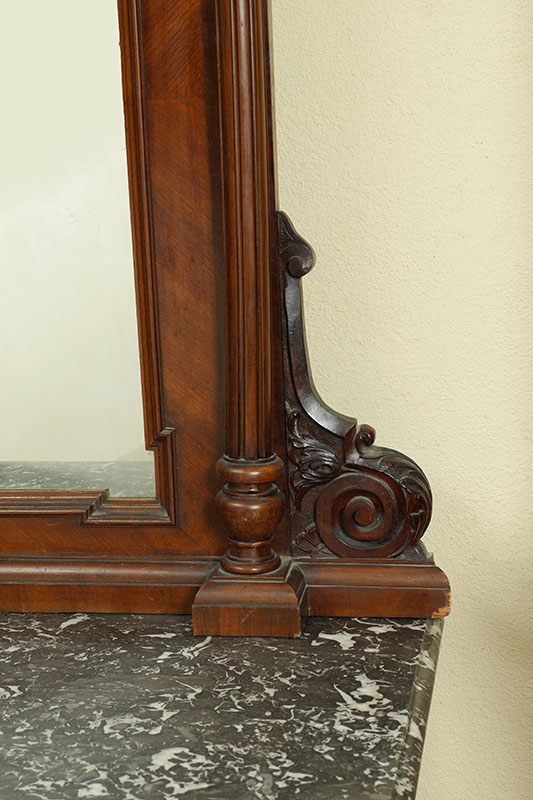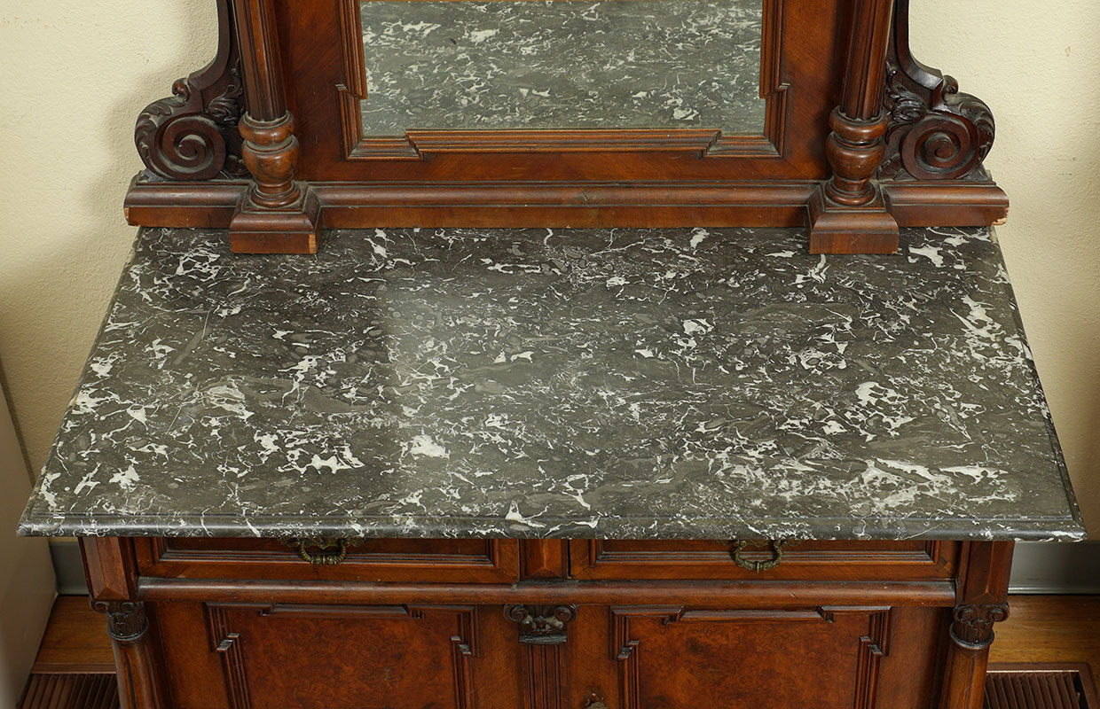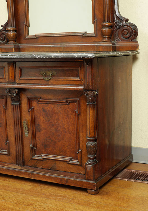 VICTORIAN CARVED MARBLE TOP DRESSER: Arched removable pediment with applied foliate scroll and phoenix motif decoration. Mirror frames with full fluted columns. Base with marble top over 2 drawers over 2 doors with burl veneer, matching full columns. Measures 77 1/2'' h. x 43 3/4'' x 25 1/4''.