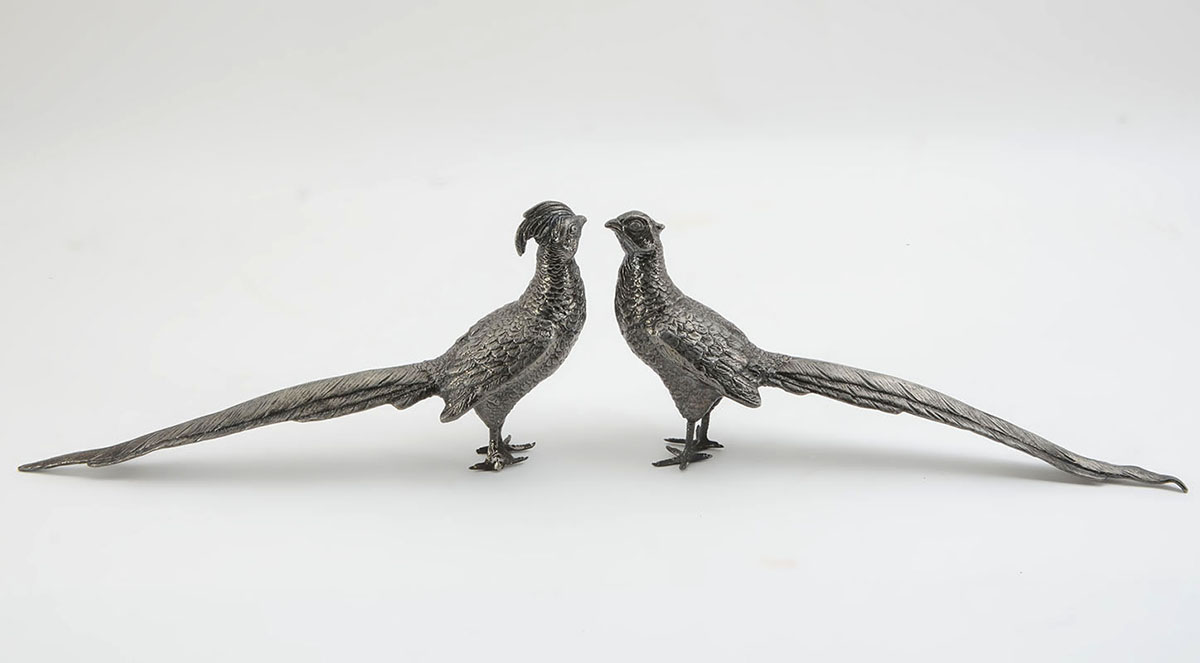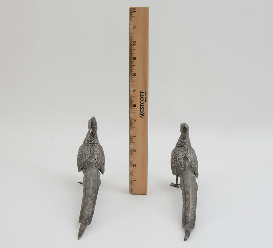 PAIR WEIDLICH BROTHERS SILVERPLATE TABLE PHEASANTS: Marked with W.B. Mfg. Co., Copyrights, 2275, USA. Larger measures 4 3/4'' h. x 9 3/4'' long.