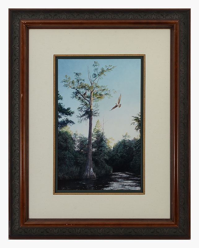 ROWE, Charles, (American, 1950-): Photorealist Florida Backwater with Cypress and Osprey Soaring, Oil/Wood, 17.75'' x 11.75'', signed lower left, custom frame, 30'' x 23.5''. Rowe is considered one of the premier landscape/wildlife artists in the Southeast and has been recognized as an artist to watch in the South.