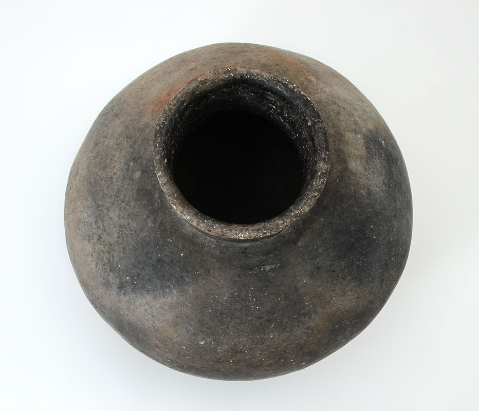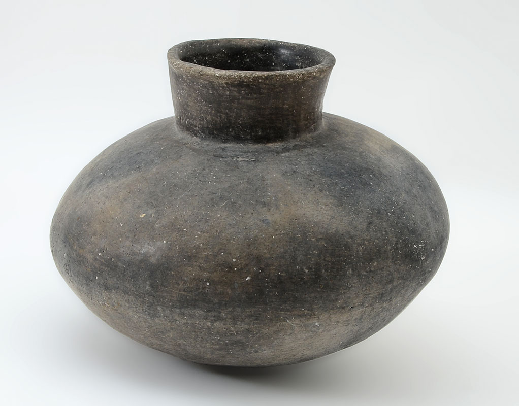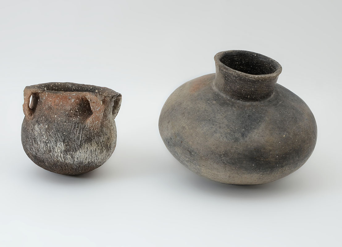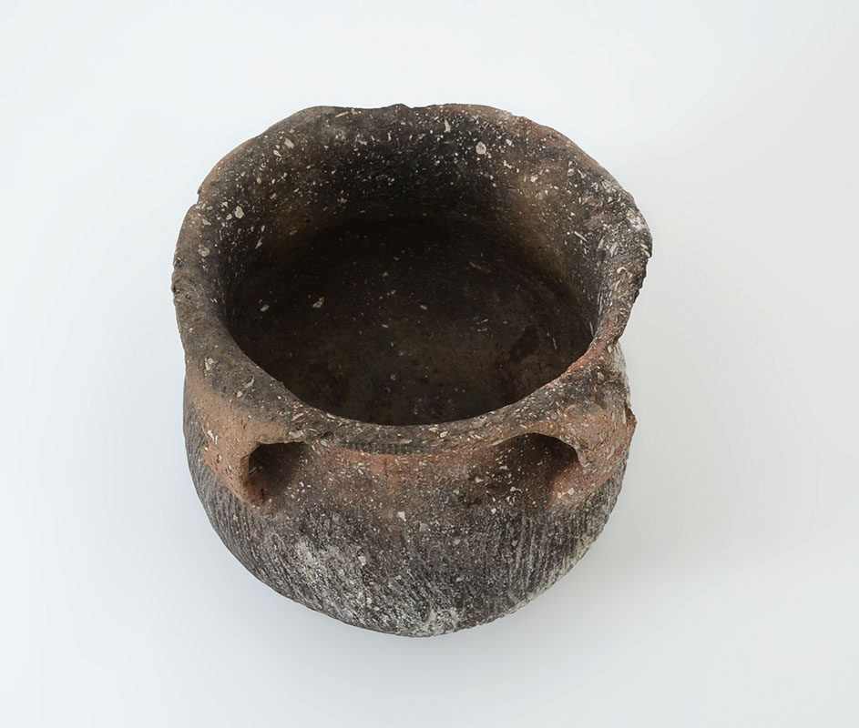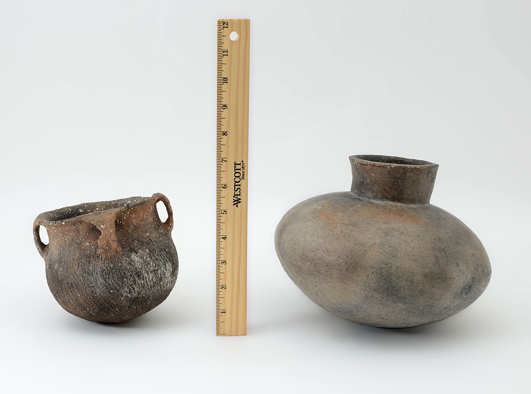2 MISSISSIPPIAN? POTTERY VESSELS: 2 pieces total, most likely Mississippian culture, to include 1) Larger pot, 6 1/2'' h. x 8 1/2''. 2) 4 handled vase with incised lines, 5'' h. x 5 1/2''. CONDITION: #2 with rim chips, both with obvious signs of use.