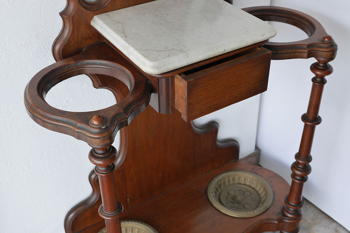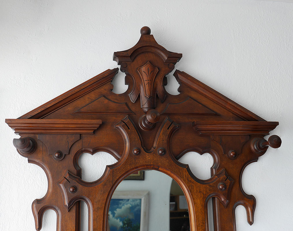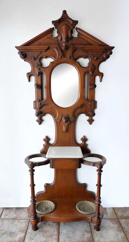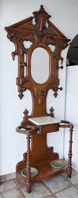 VICTORIAN CARVED WOOD HALL TREE: Crest with applied decoration, center oval mirror, 8 wood hooks, marble top over single drawer flanked by umbrella holders, cast metal inserts on base. Overall 88'' h. x 31'' x 14 3/4''.