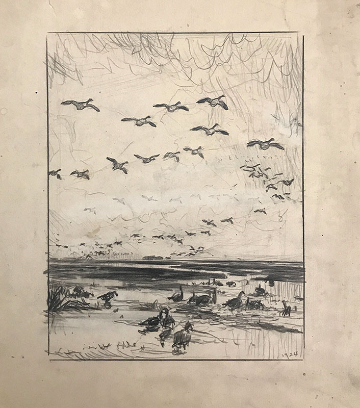BENSON, Frank Weston, (American, 1862-1951): Ducks on the Marsh, Pencil Drawing, dated 1924 lower right, unframed, image size 8'' x 6'', dated 1924 lower right, partial sketch verso.