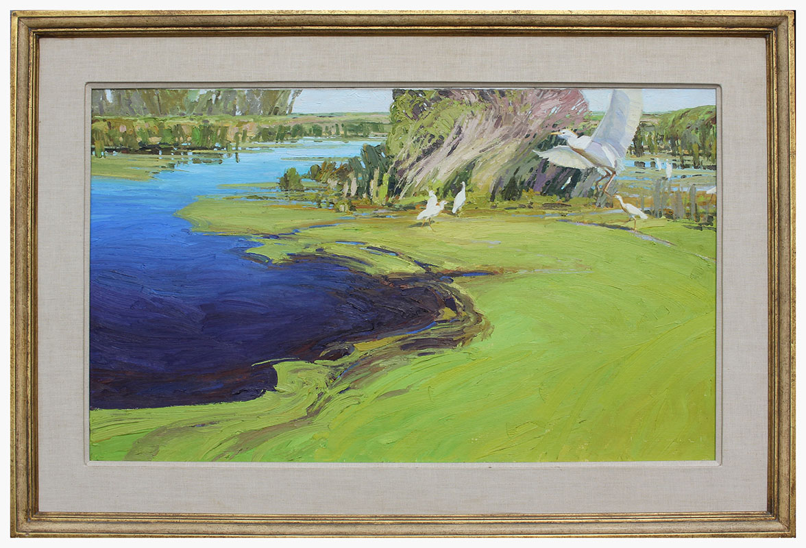 CHMIEL, Len, (American, 1942-): ''Egrets and Indigo'' Louisiana Landscape, Oil/Canvas, 30'' x 50'', signed lower right, gilded frame, 41.5'' x 61.5''. Purchased from the artist directly at a showing in Denver in 1980.
