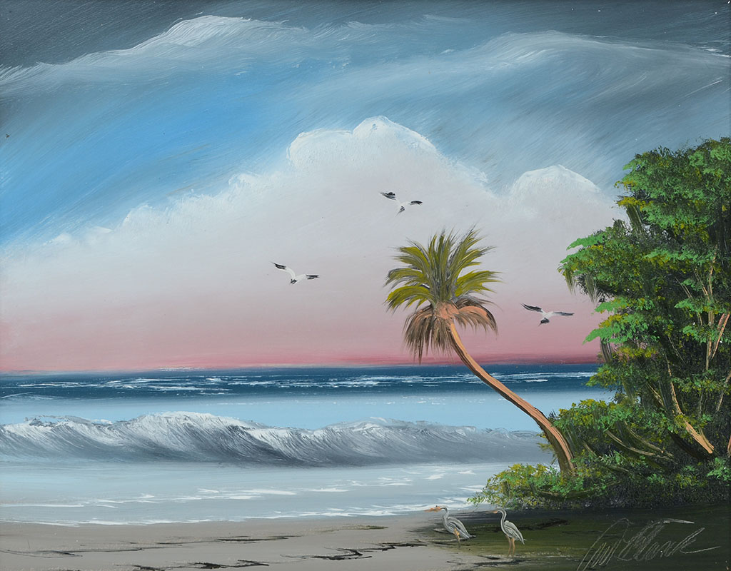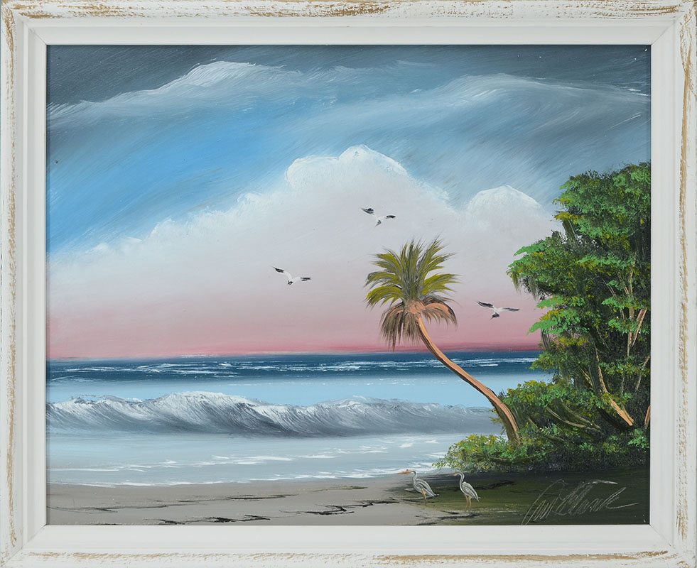 BLACK, Al, (American, 20th Century): Florida Highwaymen beach scene with trees and birds, vibrant pastel colors, Oil/Masonite, signed lower right, 16'' x 20'', framed 17 1/2'' x 21 1/2''.