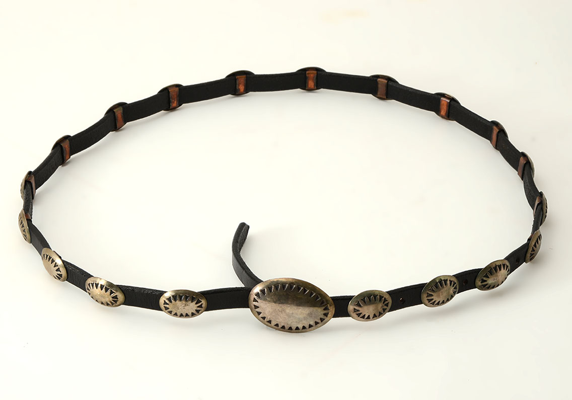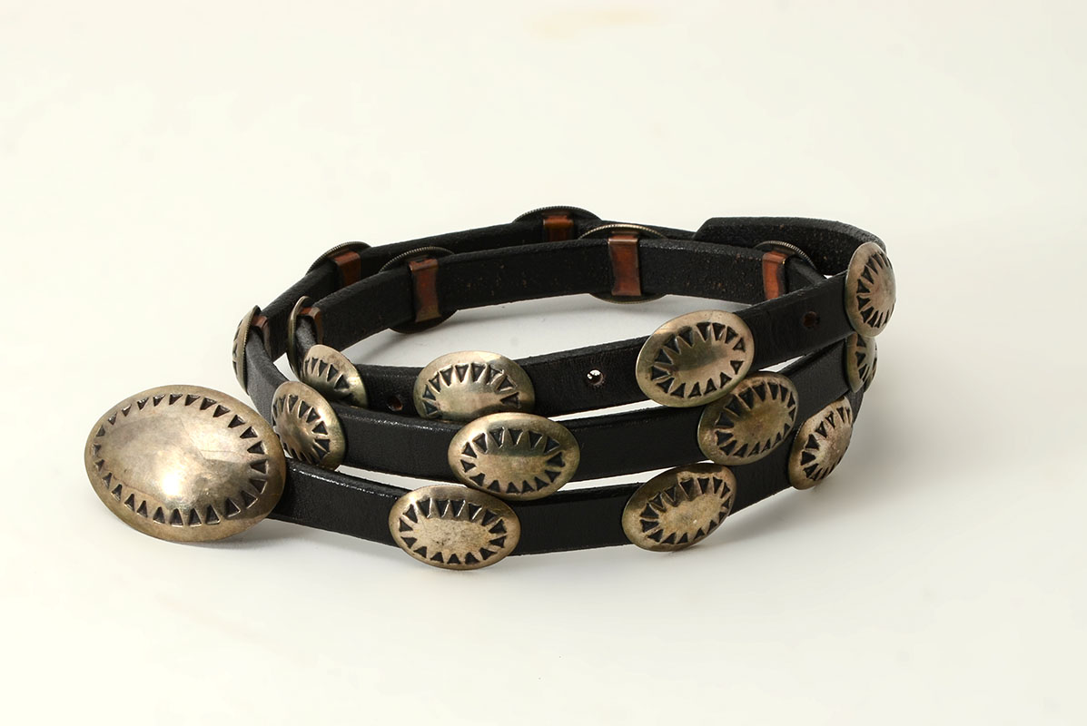 NAVAJO SILVER CONCHO BELT: Thin diminutive belt with silver buckle and sunburst design medallions, copper slides, leather belt. No visible signature, overall 38 1/4'' long.
