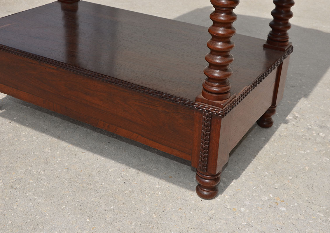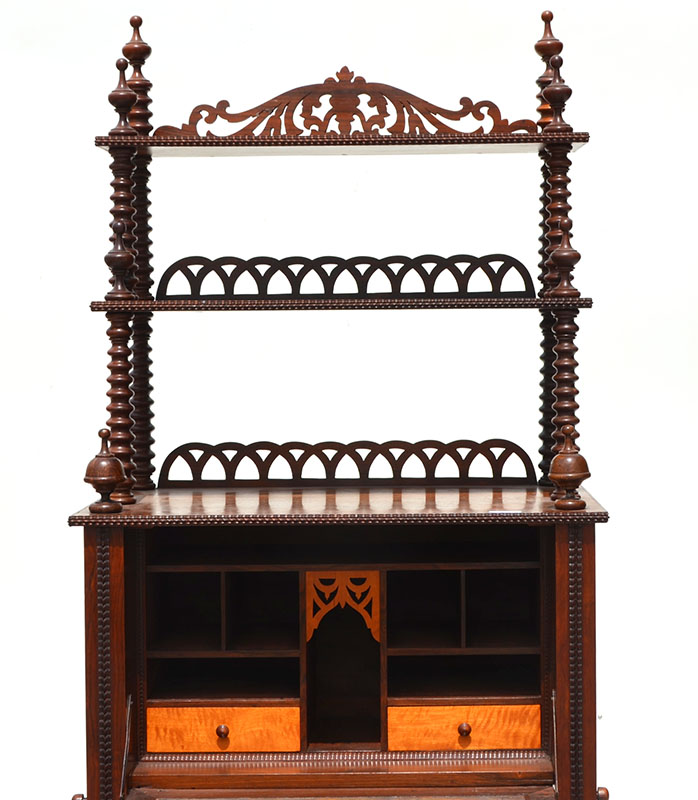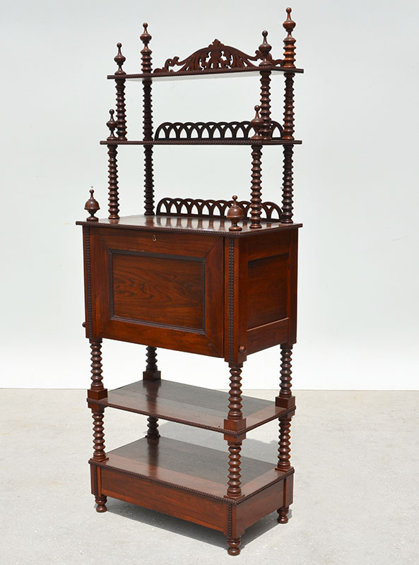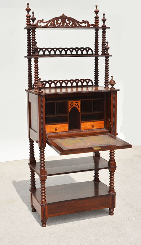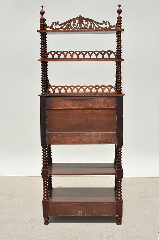 AMERICAN VICTORIAN ROSEWOOD ETAGERE DROP FRONT DESK: Mid 19th century, 2 top shelves with pierced carved backsplash and turned supports, spire finials. Center fall front desk, fitted interior with 2 drawers and pigeon holes. 2 open lower shelves with hidden drawer under lowest shelf. Overall measures 75 1/2'' h. x 29 1/2'' x 16 1/2''.