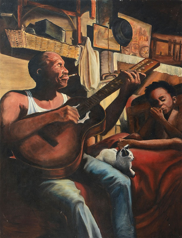 BLACK AMERICANA FOLK ART GUITAR PLAYER PAINTING: Oil on Canvas, 40'' x 30'', possible monogram lower right, dated '78, unframed.