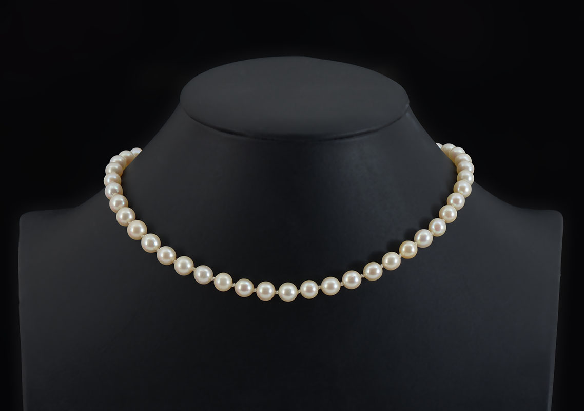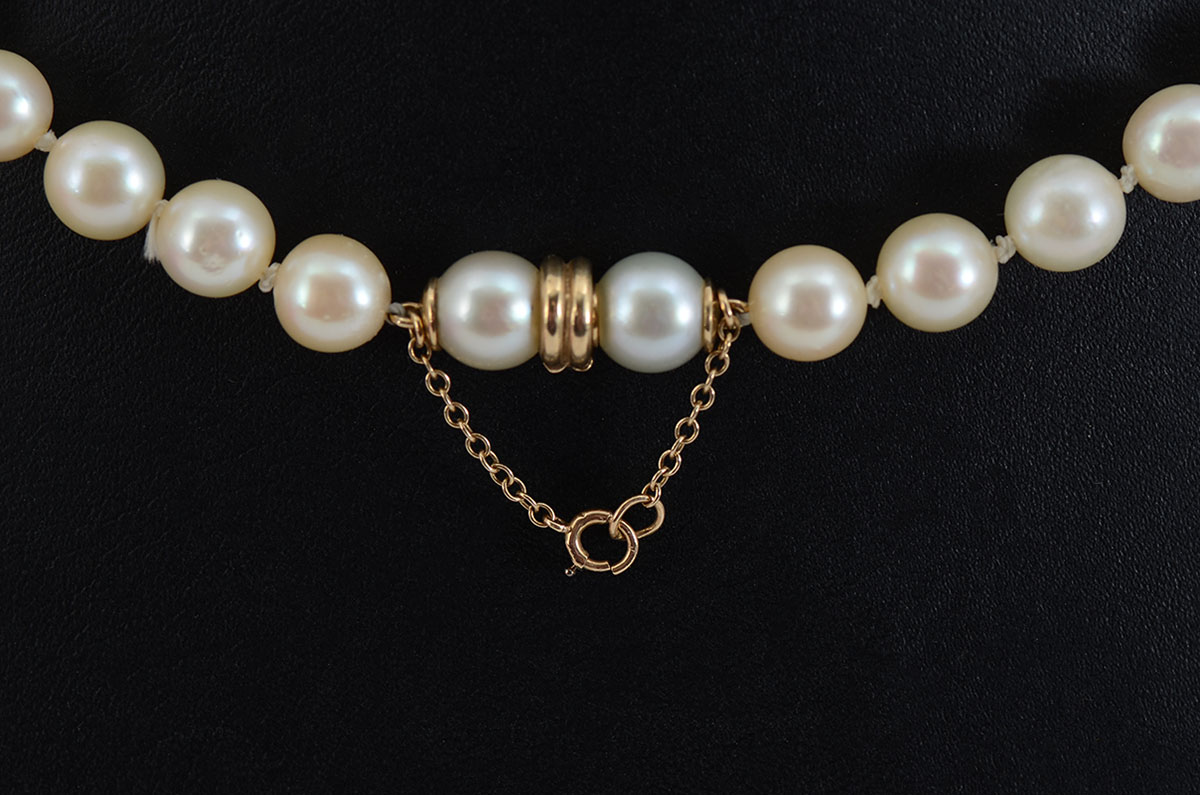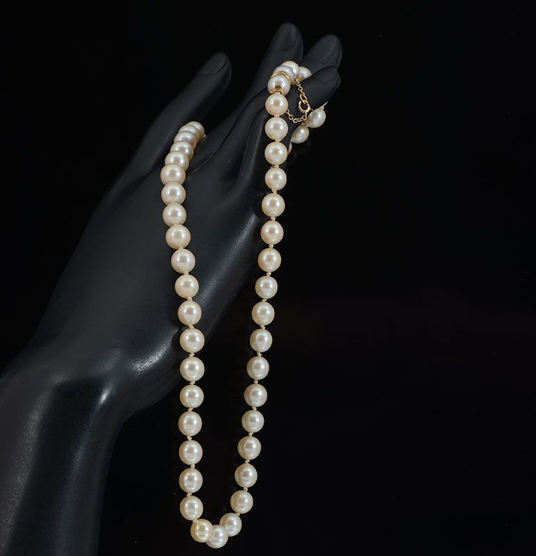 CLASSIC 12'' PEARL NECKLACE: Lovely single strand necklace with pearls ranging from 7.00 to 7.50 with 14k yellow gold safety chain and clasp. 17'' length.