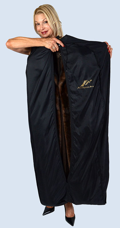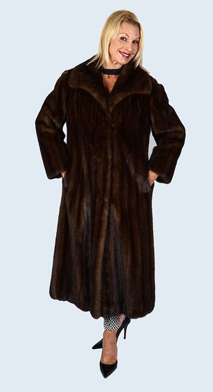 BEAUTIFUL FULL LENGTH MINK COAT: Fully lined from Flemington furs, this medium brown mink coat is fully lined with bell sleeves and an open shawl collar. Always kept in cold storage - in excellent condition. Approximate measurements: 27'' from neck to sleeve cuff/hem, 16.5'' across back and 46'' length from neck to hem. Sold with storage bag and fur hangar.