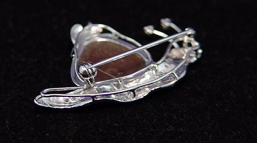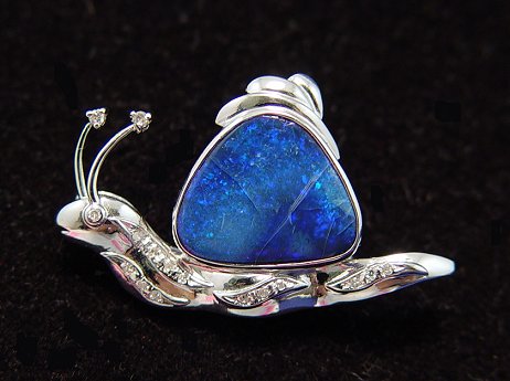 14K DIAMOND & OPAL SNAIL PENDANT/PIN: 14K white gold pin contains one 5.00 Ct. black opal. The opal is cracked. 16 round single cut and full cut diamonds. Weight: .12 Ct. Rated SI-I1 in clarity and H-I in color. Bar pin clasp. Weight: 5.6 grams.