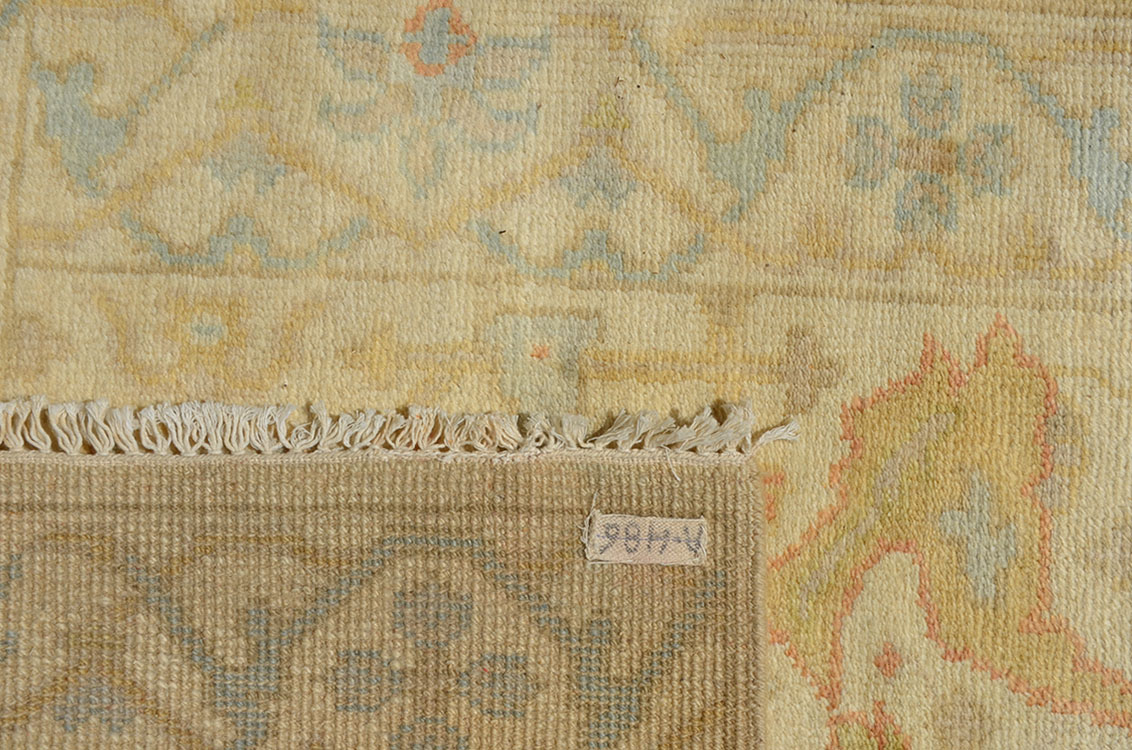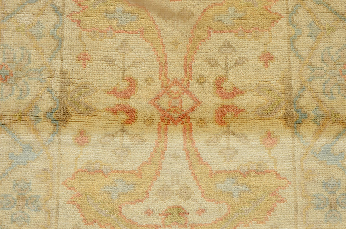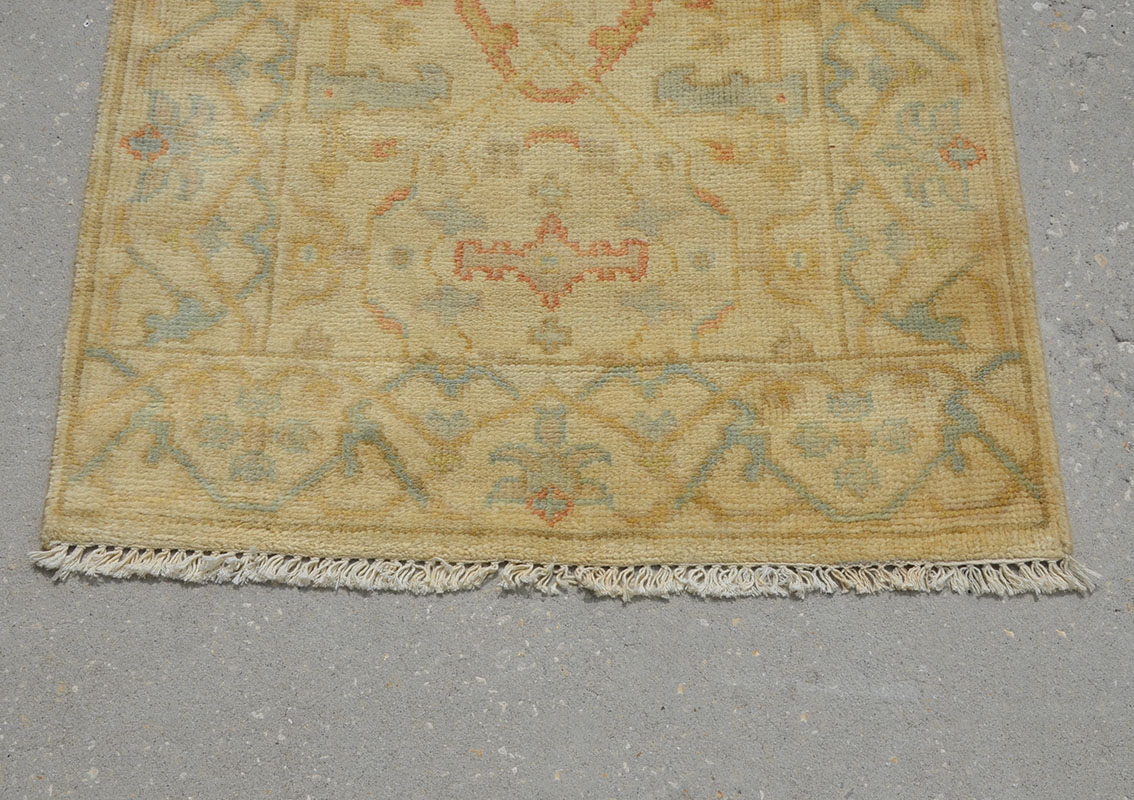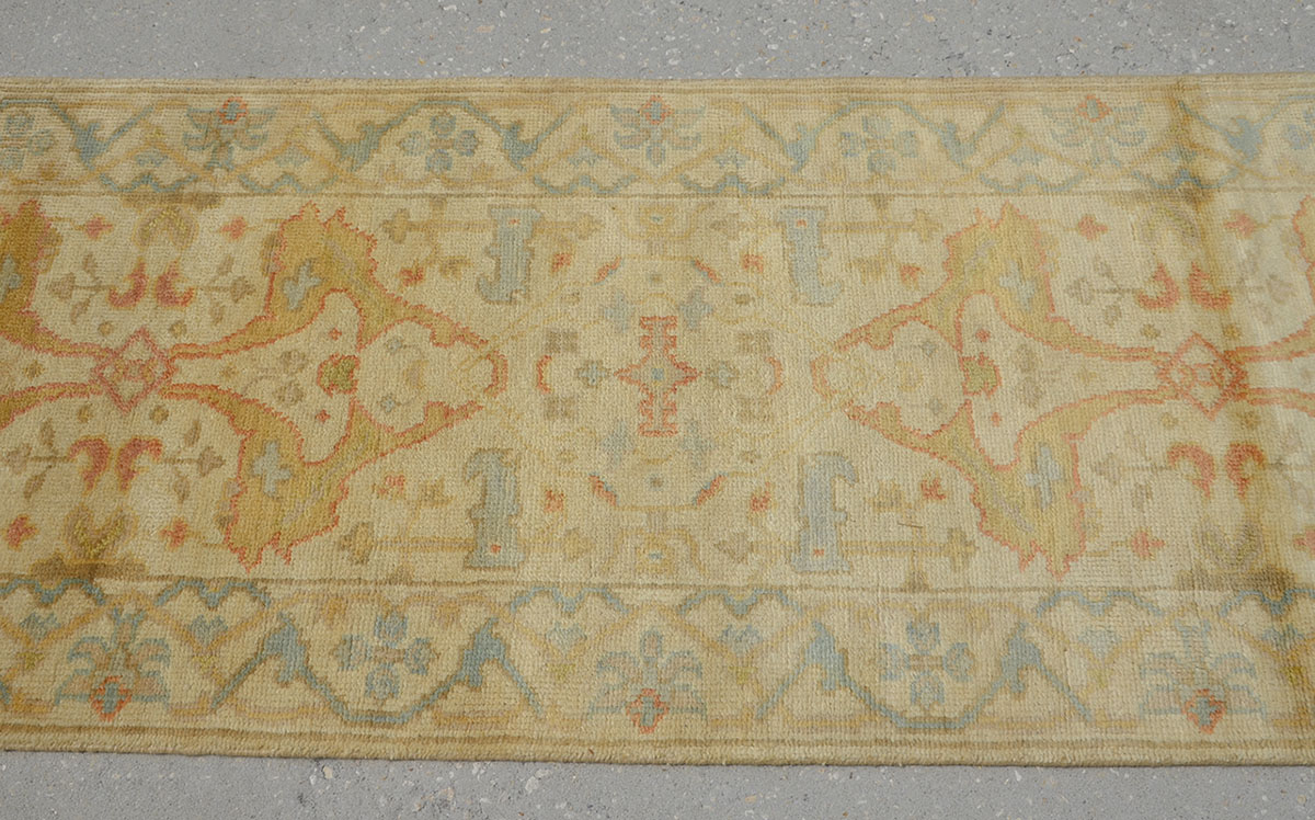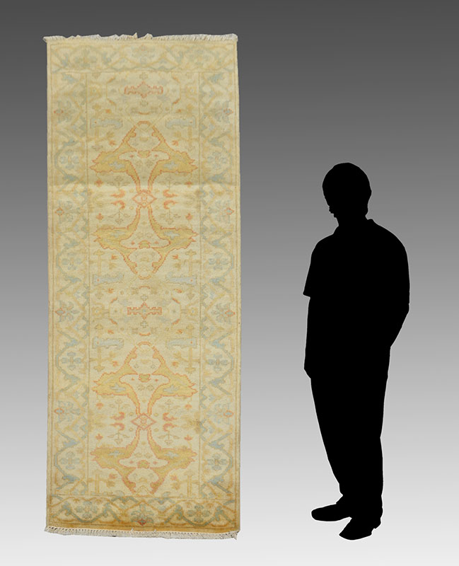 APPROX 20-40 YR OLD INDO-TURKISH OUSHAK HAND KNOTTED WOOL RUNNER, 2'7'' X 8': A good looking Indian Oushak runner with all soft colors, the field and the border of this rug are white. The central design has a nouveau feel to it and the border is delineated from the field by thin lines. A pale blue scalloped ric-rac outline meanders around single flower heads.