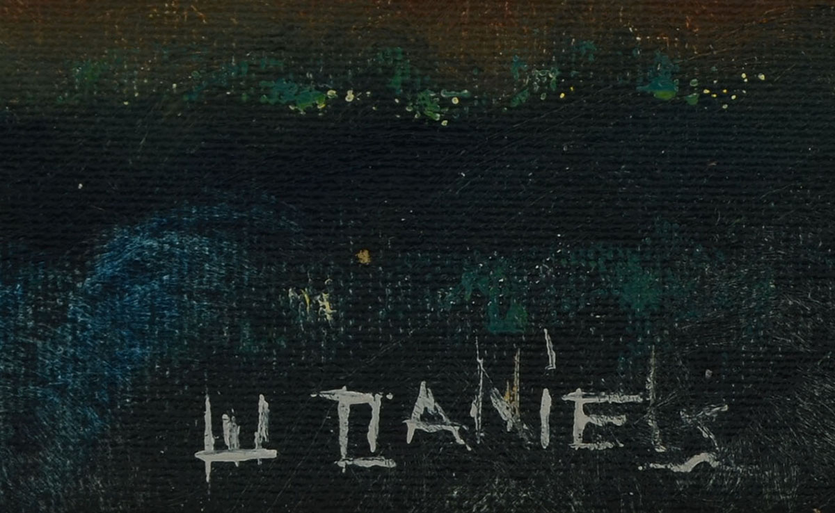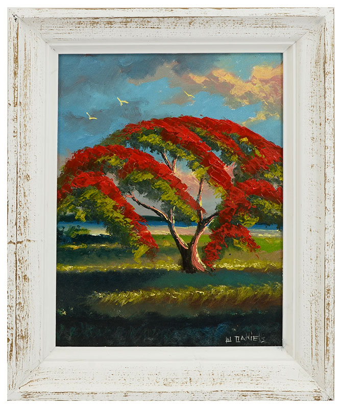 DANIELS, Willie, (American, 20th Century): Florida Highwaymen Royal Poinciana by the waters edge, Oil/Board, signed lower right, 16'' x 12'', framed 19 1/2'' x 15 1/2''.