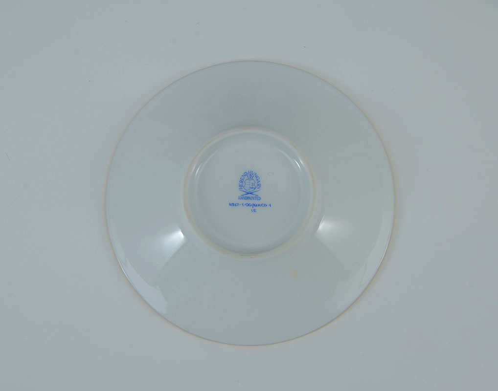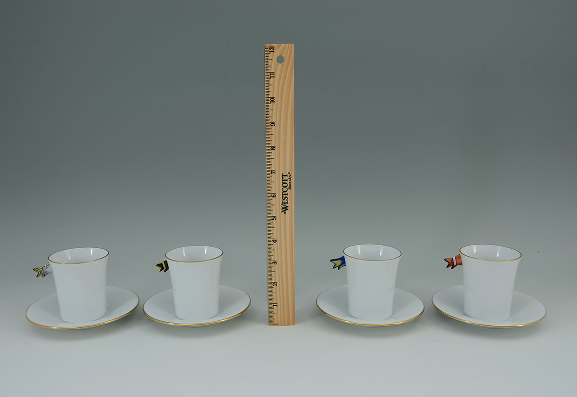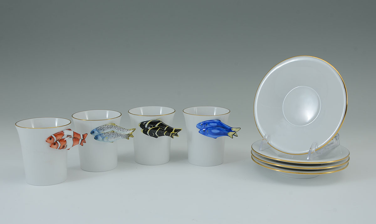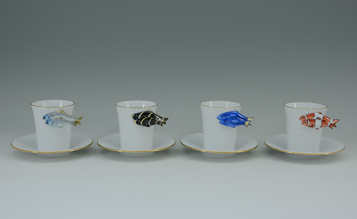 4 HEREND TROPICAL FISH HANDLE TEACUPS & SAUCERS: Set of 4 teacups with applied assorted tropical fish handles (3'' h.) and 4 saucers (5'' dia).