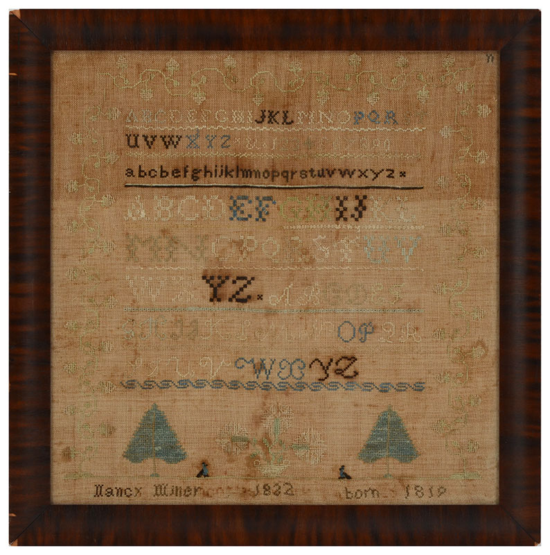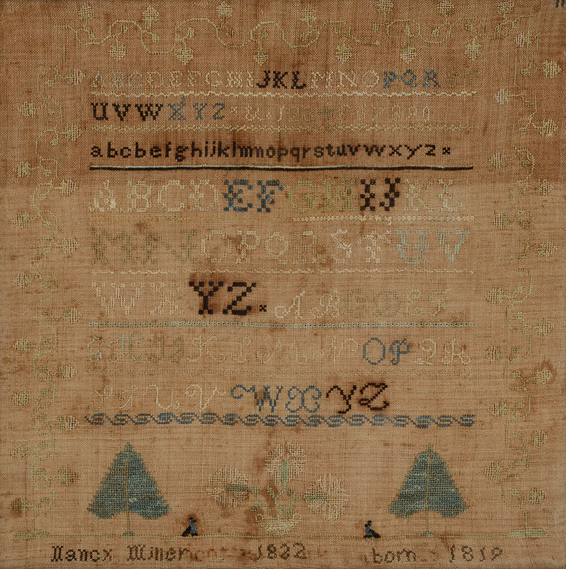NANCY MILLER 1832 DATED SAMPLER: American sampler dated 1832 with multiple alphabet, trees, flowers, birds and vine border. Signed Nancy Miller, 1832, Born 1819. Sight size 16 1/2'' x 16 1/2'', framed 19 1/2'' x 19 1/2''.
