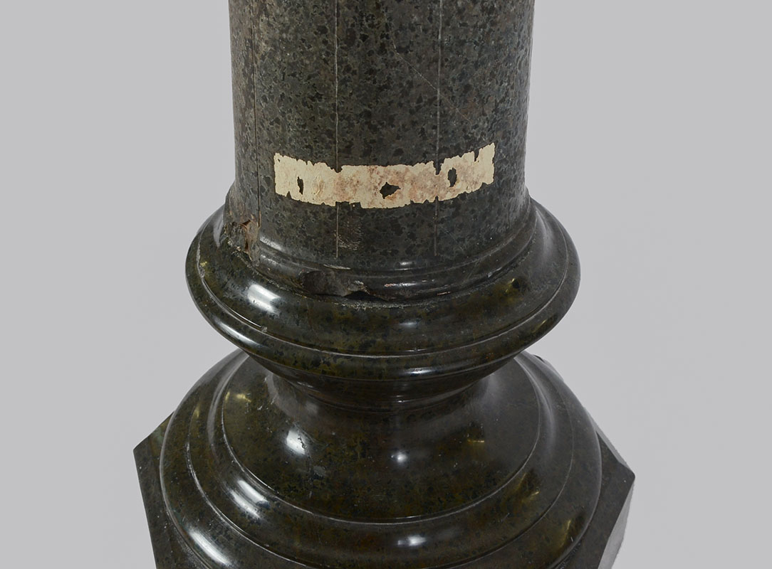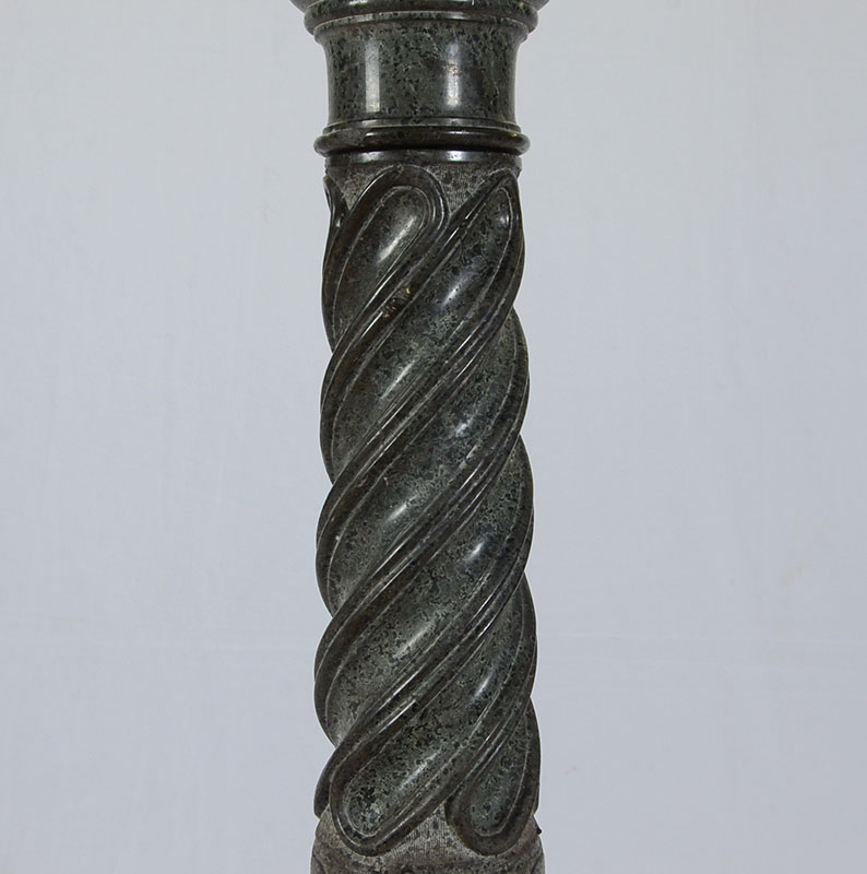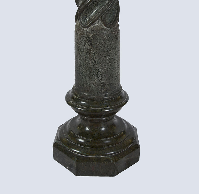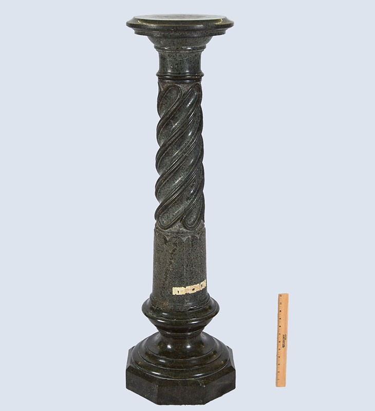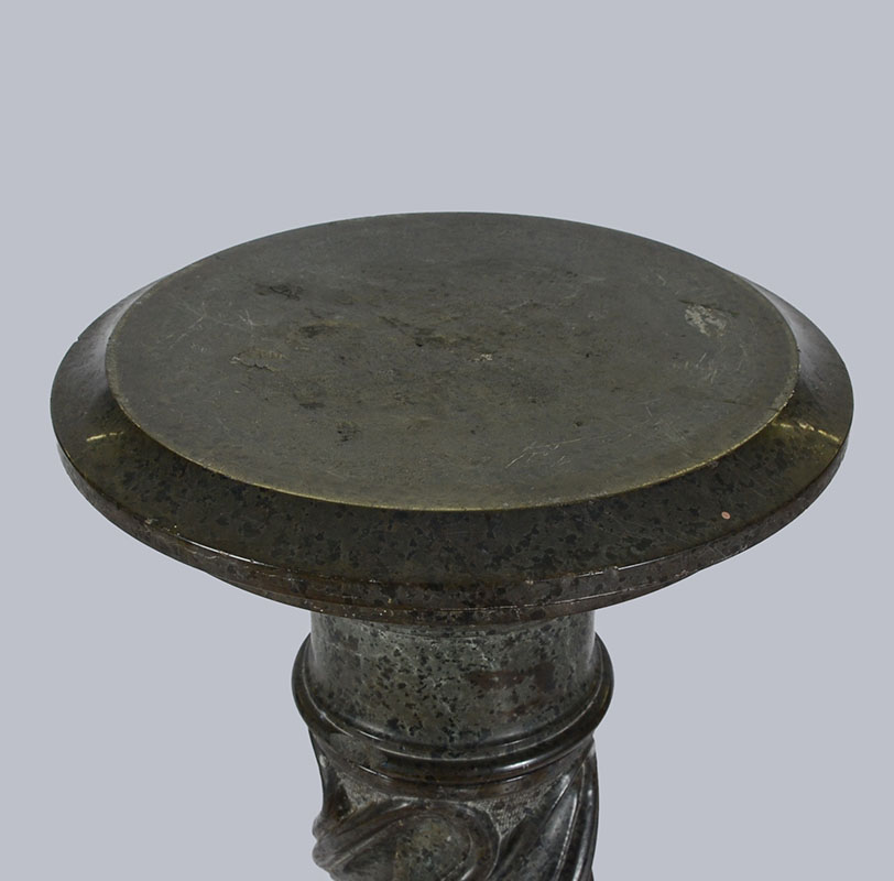 CARVED GREEN MARBLE PEDESTAL: Round top, carved pedestal body with twist design, octagonal base. Overall measures 43 1/2'' h., top 12'' dia, base 13'' dia.