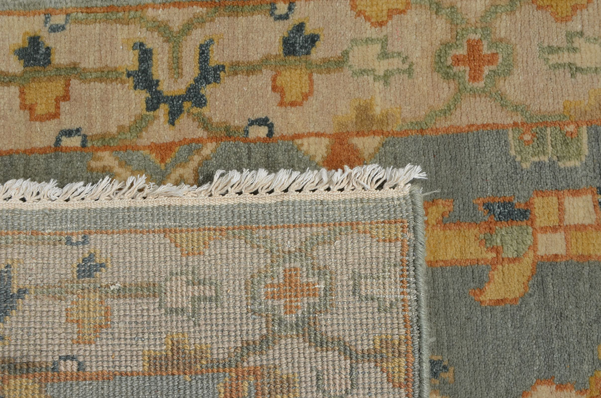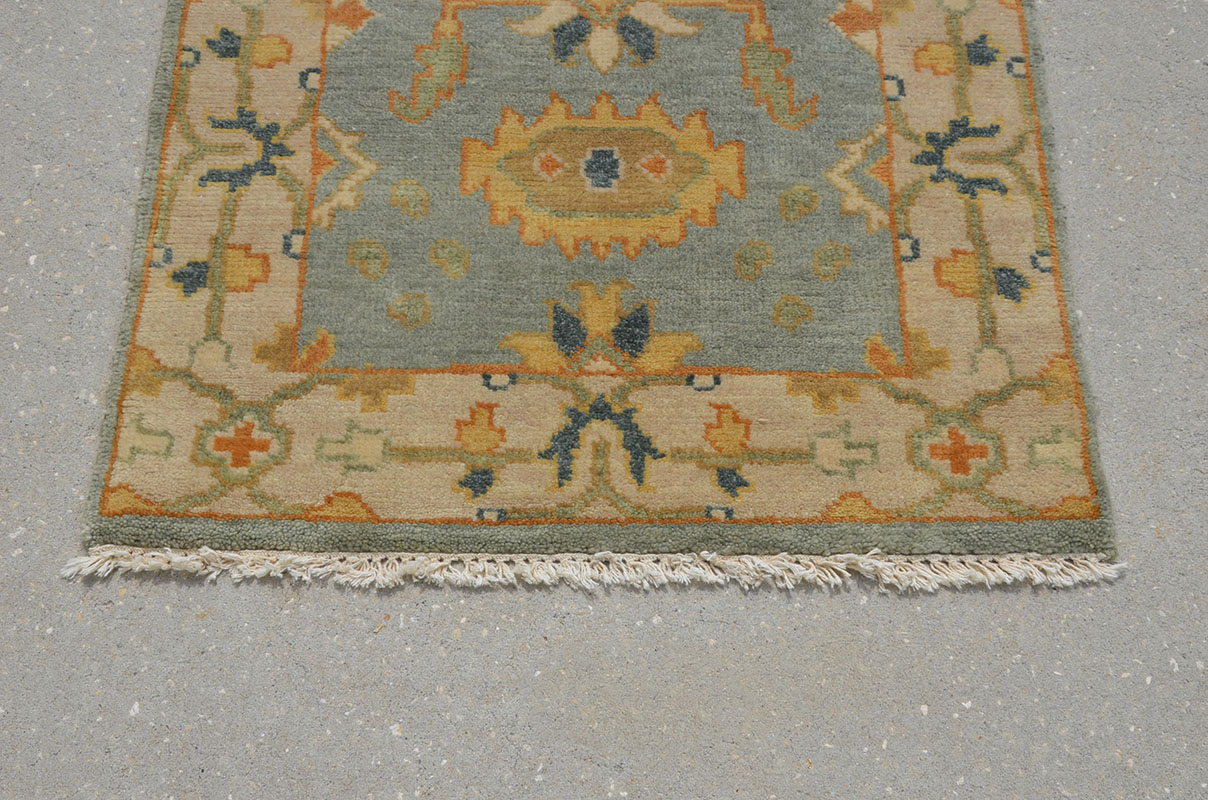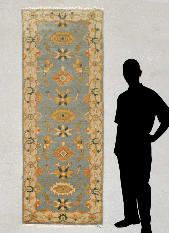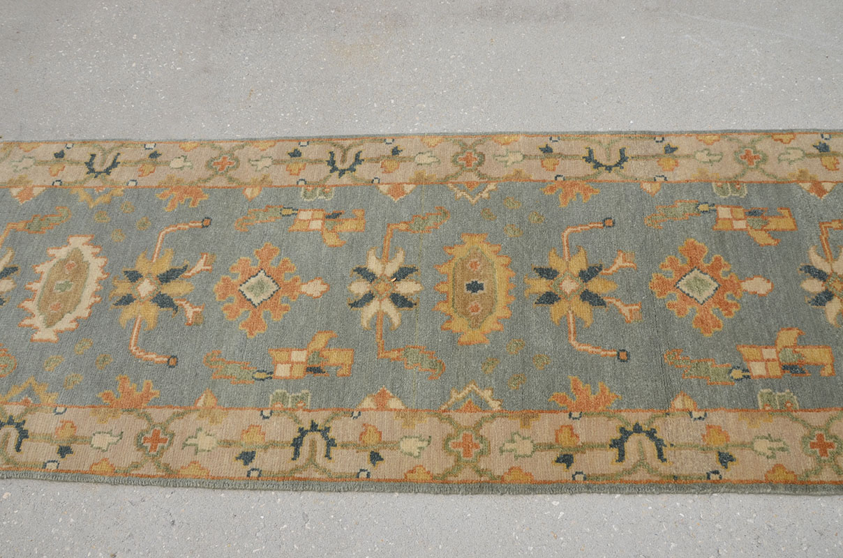 APPROX. 20-40 YEAR OLD INDO PERSIAN OUSHAK HAND KNOTTED RUNNER, 2'6'' x 8': This runner has a traditional Oushak design but was made in India. The pale blue field has a row of different simple geometric designs done in colors that include white, pale pumpkin, green, yellow, and beige. Smaller motifs are on either side of each design. A white border frames the field of this runner.