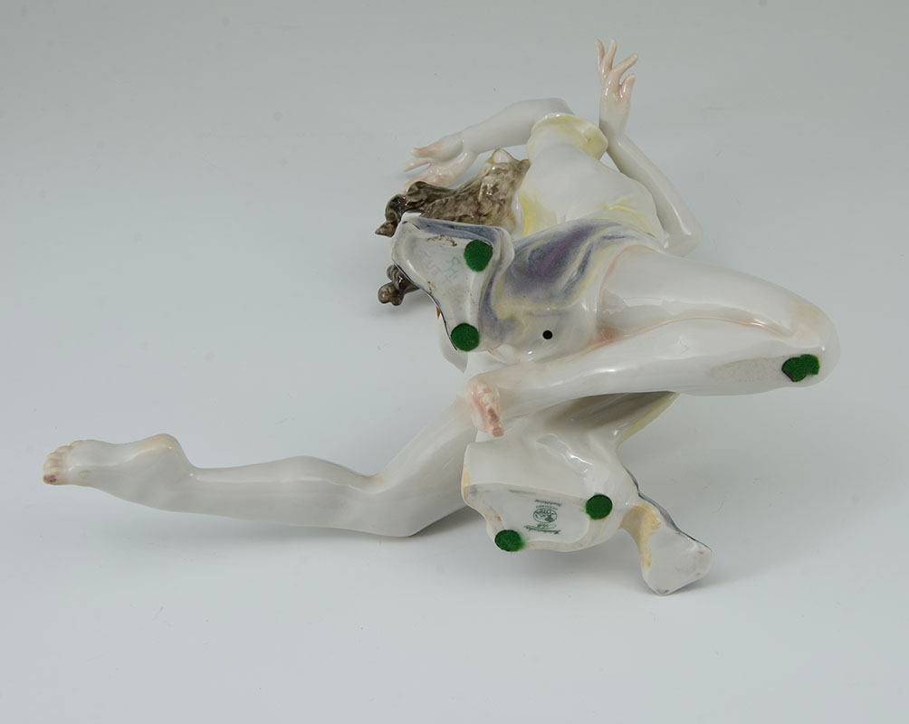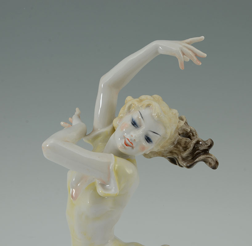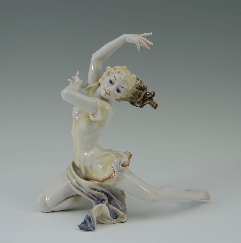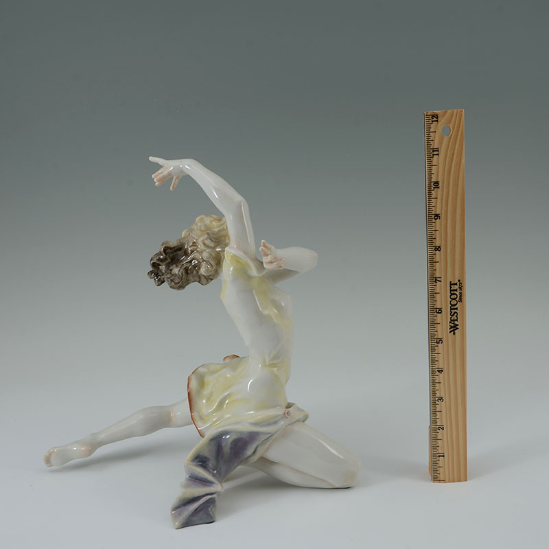 HUTSCHENREUTHER PORCELAIN DANCER FIGURE: Graceful figure of a dancer, green Hutschenreuther mark, impressed Tutter. Overall 11 1/4'' h. x 12'' x 7''.