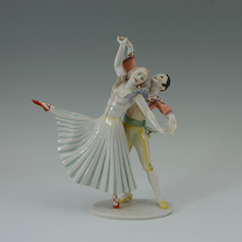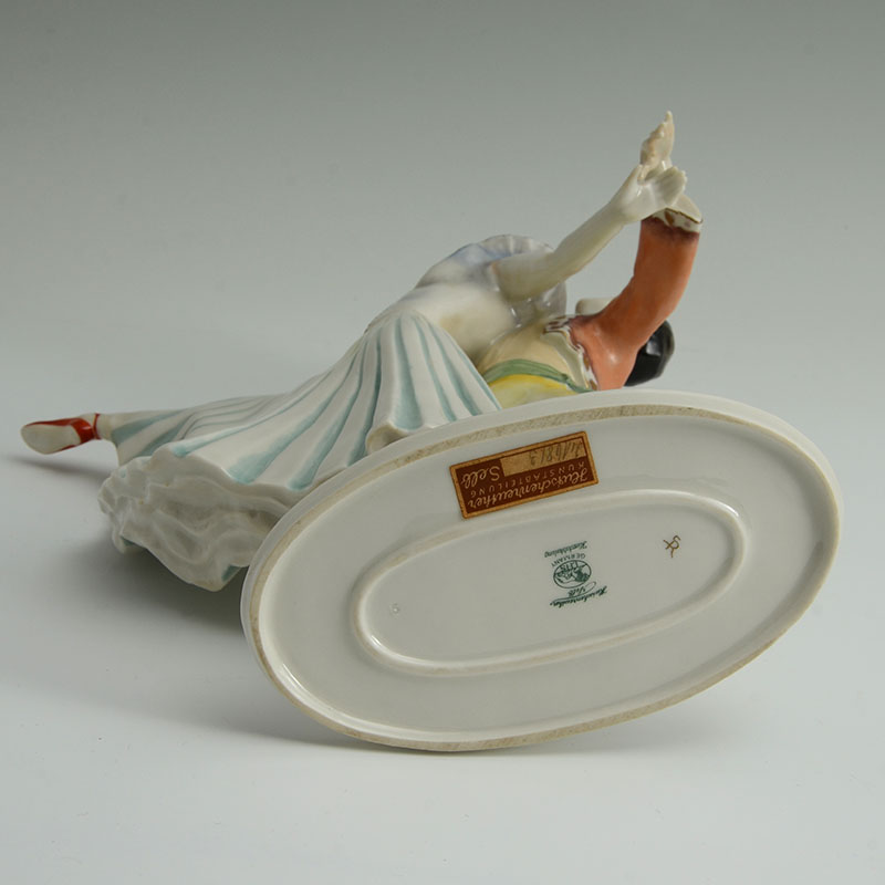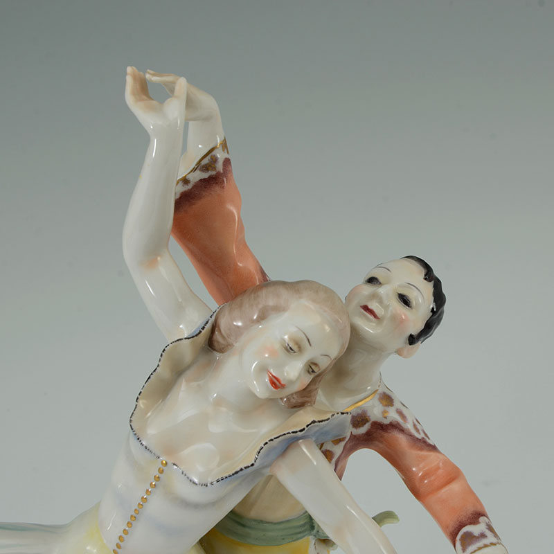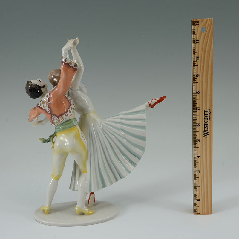 HUTSCHENREUTHER PORCELAIN FIGURE OF TWO DANCERS: Polychrome decorated figure of 2 Flamenco dancers, green Hutschenreuther mark, original paper label. 11 3/4'' h. x 9 1/2'' x 3''.