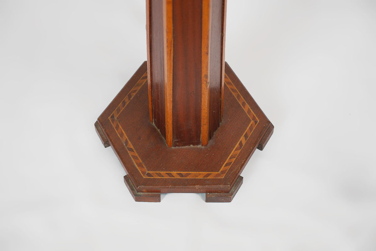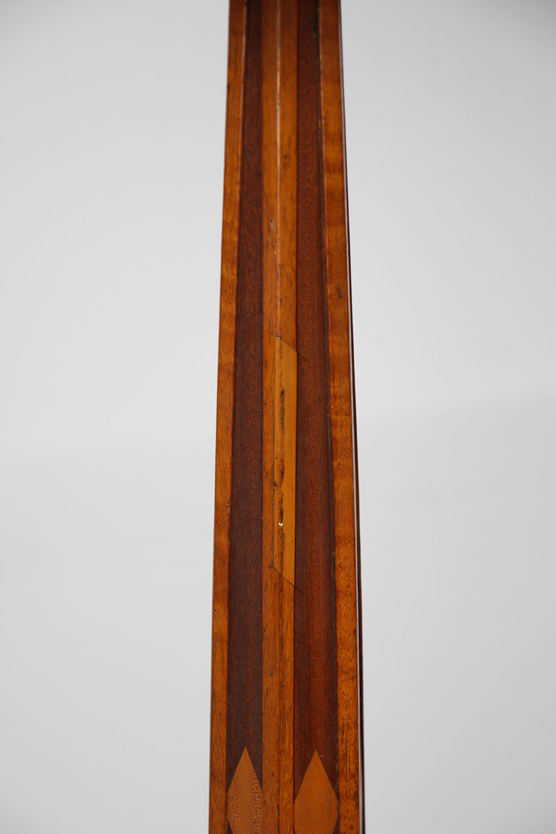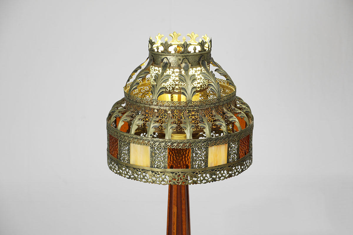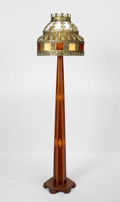 PARQUETRY INLAID WOOD FLOOR LAMP WITH PIERCED BRASS SHADE: Parquetry inlaid base, hexagonal tapered stem with inlaid diamonds, triple socket fixture. 3 tier patinated pierced brass shade with foliate motifs, caramel and amber dimpled glass panels. Overall with shade 60 1/4'' h. x 15''.